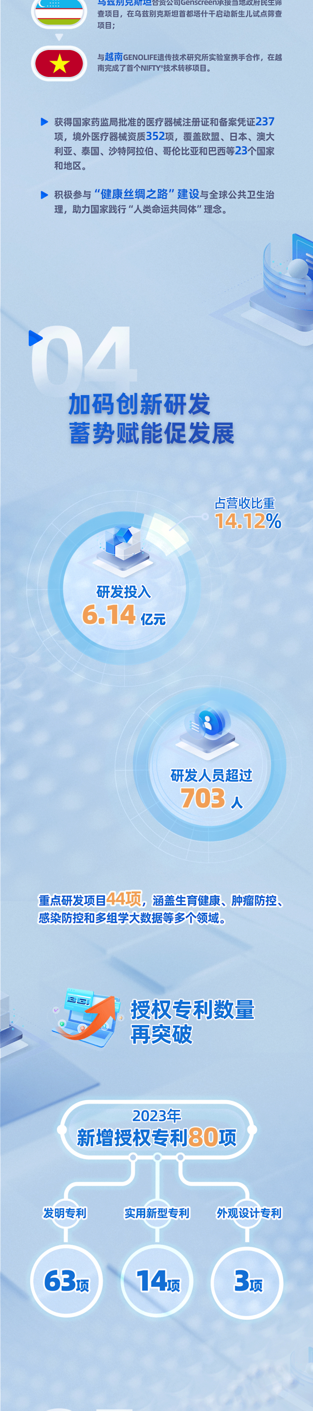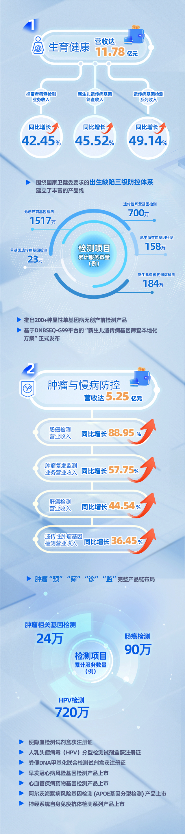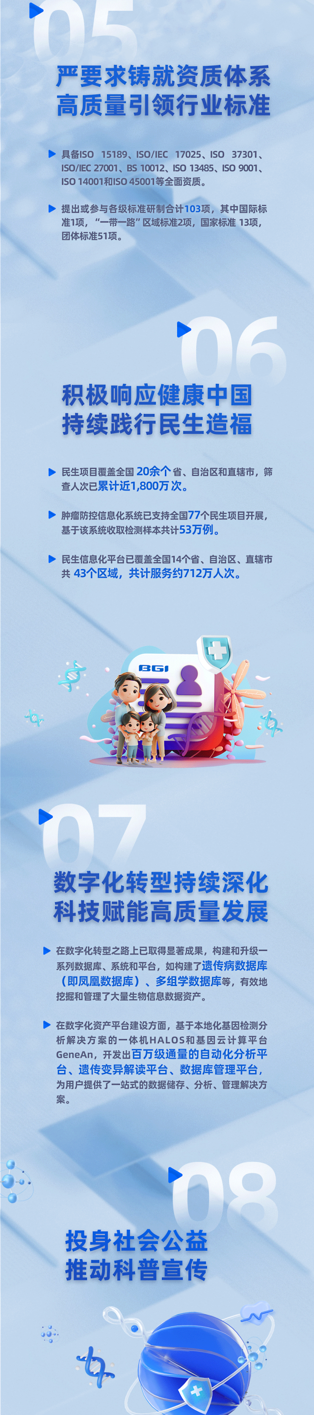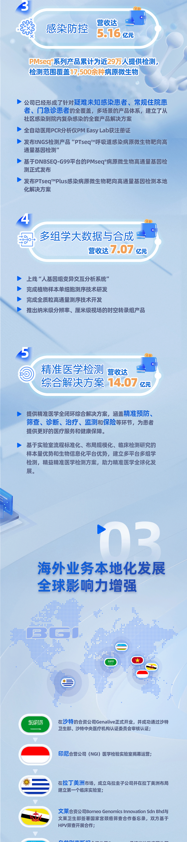 华大基因作为中国基因行业的奠基者,秉承“基因科技造福人类”的使命,通过 20 多年的人才积聚、科研积累和产业积淀,已建成覆盖全球百余个国家和全国所有省市自治区的营销服务网络,成为屈指可数的覆盖本行业全产业链、全应用领域的科技公司,立足技术先进、配置齐全和规模领先的多组学产出平台,已成为全球屈指可数的科学技术服务提供 商和精准医疗服务运营商。 《“十四五”规划》提出要构建强大公共卫生体系,强化慢性病预防、早期筛查和综合干预,为行业带来历史性机遇,也对企业提出了更高的要求。“加快推动从以治病为中心转变为以人民健康为中心”“坚持预防为主,防治结合”等一系列政策的提出为生命健康行业的早筛早诊早治、预防关口前移指明了方向。 公司主营业务为通过基因检测、质谱检测、生物信息分析等多组学大数据技术手段,为科研机构、企事业单位、医疗机构、社会卫生组织等提供研究服务和精准医学检测综合解决方案。华大基因以推动生命科学研究进展、生命大数据应用和提高全球医疗健康水平为出发点,基于基因领域研究成果及精准检测技术在民生健康方面的应用,致力于加速科技创新,守护人类卫生健康共同体,抑制重大疾病对人类的危害,以减少出生缺陷,加强肿瘤防控,精准治愈感染,推行慢病防控,助力精准医学。 |