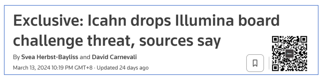去年,在Carl Icahn与Illumina大战的“成果”主要是干掉了CEO Francis deSouza和董事张John Thompson。 当然,这里面还有个小的战利品:Andrew Teno在Illumina的董事会席位。 这段历史,各位有兴趣可以点击这里详细了解一番。 不管怎么说,这个战利品不算大,好歹也是个董事会的席位。 不过,根据本次Illumina公布的董事会提名名单,似乎Andrew Teno要消失了。 从本次公开的提名名单中可以看出来,只增加了一名董事人选,而Andrew Teno则不见了。 新提名的Anna Richo 在Depaul University获得法学博士学位,后主要在药圈任合规、法律顾问等工作。 2019年开始,Anna Richo担任Cargill(嘉吉)公司的高级副总裁和合规事物总负责人。 看起来一个对生命科学、医药领域的法律法规非常熟悉的强人。 话说回来,Carl Icahn 的让步其实并不是突然之间的。 此前,路透社在2024年3月13日就提到了Icahn放弃Illumina董事会席位的事。 究其原因,可能有以下3点: 第一,Illumina更换CEO/董事长的诉求已经达到。 第二,拆分GRAIL的诉求已经达到。 第三,已经失去了再次挑战Illumina的天时。 随时Jacob Thaysen的上台,拆分GRAIL已经成了板上钉钉且刻不容缓的首要事项。 至于Carl Icahn是否能从中获益,我们并不清楚。 但是有一点可以肯定,这段事件他的日子也过的并不好。 近一年,Icahn的主要产业Ichan Enterprise LP(IEP)股价跌幅高达67%,甚至远远高于Illumina的44%。 所谓攘外必先安内,后宫都不稳了,哪有闲工夫到处招惹是非... PS:此前我好像忽略了个问题,CEO Jacob Thaysen 才48岁啊... 人比人...气死人... 相关资料: 注1:https://d18rn0p25nwr6d.cloudfront.net/CIK-0001110803/e22ccaa1-d59d-4fce-929d-f29f98931504.pdf 注2:https://endpts.com/icahn-gives-up-seat-on-illumina-board-backing-away-from-challenge-to-diagnostics-company/ |