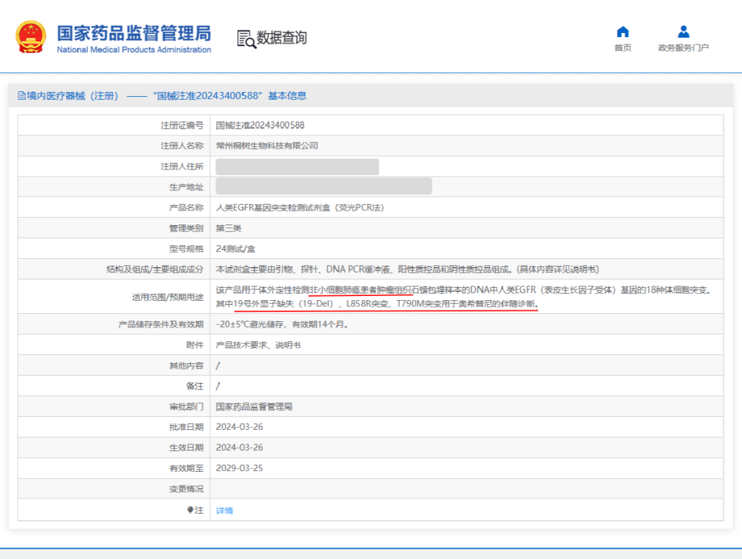 目前已经获得国家药监局获批的使用PCR技术检测EGFR突变的试剂盒共有26款,但是其中,可以用作伴随诊断用途的仅有5款试剂盒!其中,桐树基因MASS-PCR法是唯一19Del、L8585R、T790M全部获批奥希替尼伴随诊断(所有非小细胞肺癌)的检测试剂盒。