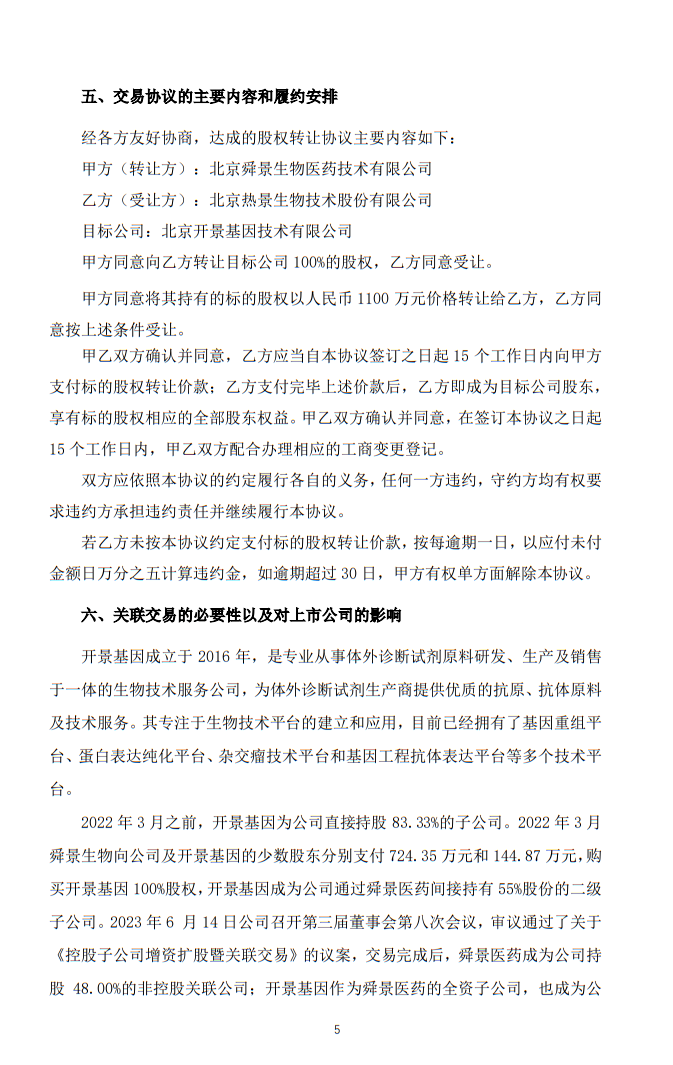 4月15日晚间,热景生物(688068)发布公告称,为整合公司及关联公司体外诊断业务,公司拟收购关联公司舜景医药持有的开景基因100%的股权。本次交易的转让价款为1100万元,全部以现金方式支付。本次交易可使得公司完全具备从体外诊断上游关键生物活性原料到体外诊断试剂及仪器研发、生产、销售的全产业链业务。 开景基因成立于2016年,是专业从事体外诊断试剂原料研发、生产及销售于一体的生物技术服务公司。热景生物表示,本次交易可优化公司业务结构,有助于统一整合公司及关联公司体外诊断业务,使得公司完全具备从体外诊断上游关键生物活性原料到体外诊断试剂及仪器研发、生产、销售的全产业链业务,有助于公司进一步聚焦发展主业,符合公司实际经营和稳健发展需要。 |