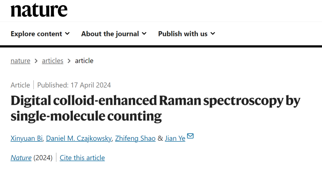 2024年4月17日国际顶级期刊Nature(《自然》)在线发表了题为“Digital colloid-enhanced Raman spectroscopy by single-molecule counting”的研究论文。该研究针对表面增强拉曼光谱领域内定量的挑战,系统阐述了基于数字胶体增强拉曼光谱(digital colloid-enhanced Raman spectroscopy, dCERS)的定量技术。基于单分子计数,dCERS成功实现了超低浓度目标分子的可靠定量检测,为表面增强拉曼光谱技术的普遍应用奠定了重要基础。
