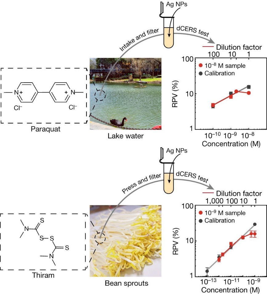 选取普通的湖水作为背景并混入微量的百草枯,该团队成功实现了低于欧盟最大残留量规定三个数量级的检测灵敏度。对于福美双,该团队选取了实验室培养的豆芽提取液,达到了优于质谱五个数量级的检测灵敏度。他们证明了,通过系列稀释的方法,检测中的背景干扰可以得到完美的抑制,从而实现准确的靶分子浓度的测量。而dCERS的超高灵敏度和可靠的统计分布是实现这些定量测量的关键基础。
