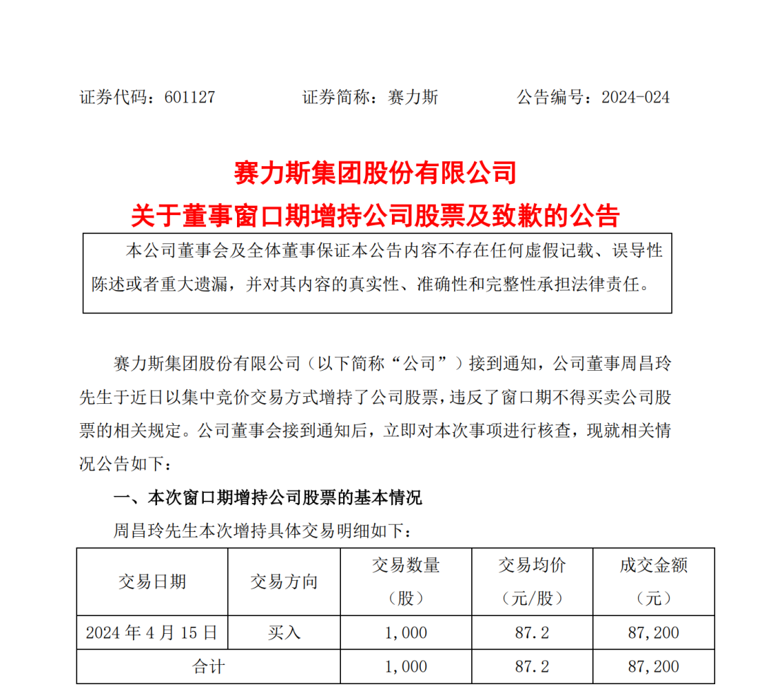 4月17日晚,赛力斯(601127.SH)发布关于董事窗口期增持公司股票及致歉的公告,指出公司董事周昌玲于近日以集中竞价交易方式增持了公司股票,违反了窗口期不得买卖公司股票的相关规定。 公告显示,4月15日,赛力斯董事周昌玲以87.2元/股的均价买入1000股赛力斯股票,成交金额8.72万元。 董事在年报窗口期增持 对此,周昌玲声明,本次窗口期交易不存在因获悉内幕信息而交易公司股票的情况,亦不存在利用内幕信息进行交易谋求利益的情形,不存在主观违规的情况。周昌玲本人已深刻认识到上述违规交易的严重性,就此对公司和市场带来的不良影响,向公司及广大投资者致以诚挚的歉意。 周昌玲承诺,其将进一步加强对相关法律法规、规范性文件的学习,严格遵守相关规定,自本次增持公司股票之日起12个月内不减持所持有的公司股票,并将加强对证券账户的管理,自觉维护证券市场秩序,防止此类事情再次发生。 赛力斯方面也表示,公司董事会知悉此事后高度重视,及时核实相关情况,并向其重申了上市公司董事、监事和高级管理人员买卖公司股票的相关规定。公司将以此为戒,进一步加强全体董事、监事、高级管理人员对《中华人民共和国证券法》《上市公司董事、监事和高级管理人员所持本公司股份及其变动管理规则》等相关法律法规及规范性文件的学习,积极督促相关人员严格遵守相关规定,杜绝此类事件再次发生。 赛力斯股价半年涨近一倍 飘红的股价背后是赛力斯问界系列的不俗业绩。3月,问界全系交付新车31727辆,并连续三个月夺得中国新势力品牌销量冠军。 不过值得注意的是,据市场数据显示,4月前两周(1日至14日),理想汽车势如破竹连续反超,累计领先问界3700余辆。 据悉,4月18日晚8点,被视为问界M7直接竞品的理想L6即将发布,暂未公布售价;而4月23日,问界也将焕新推出全新问界M5,有博主透露,问界新M5开放预订后,已快速突破6000单。伴随着新产品发布,二者之间你来我往的冠亚争夺战也将进入更白热化阶段。 图片来自赛力斯官网 |