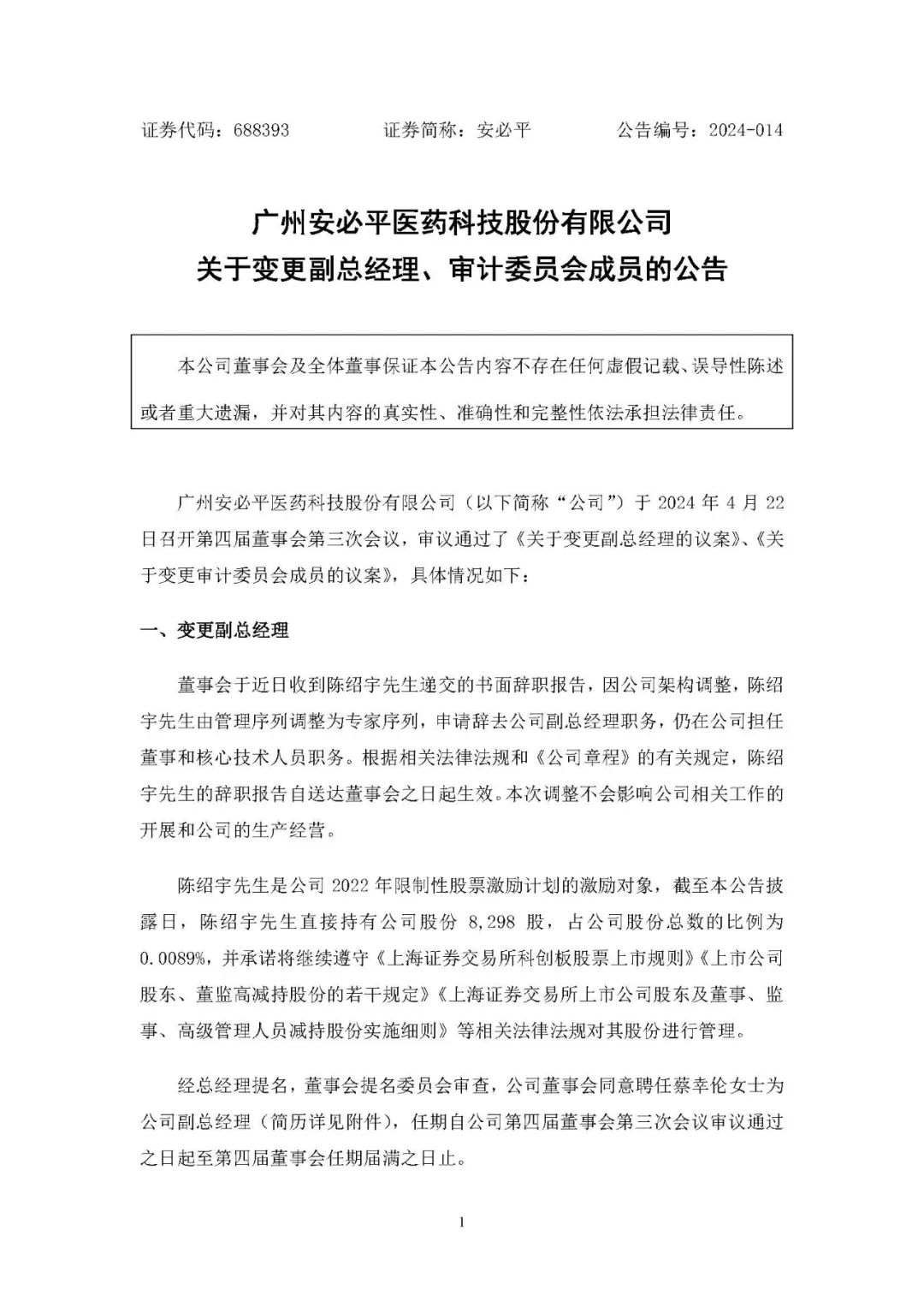 安必平4月22日公告,董事会于近日收到陈绍宇先生递交的书面辞职报告,因公司架构调整,陈绍宇先生由管理序列调整为专家序列,申请辞去公司副总经理职务,仍在公司担任董事和核心技术人员职务。