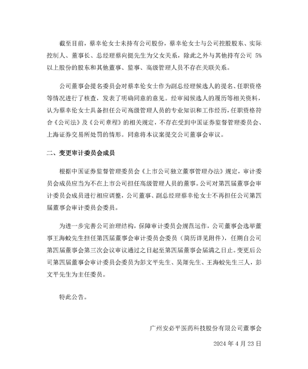 蔡幸伦女士,1990年出生,中国国籍,无境外永久居留权,研究生学历。2013 年毕业于中山大学哲学专业,2014年毕业于香港浸会大学国际新闻专业。2014 年7月至2016年7月,于广州安必平医药科技股份有限公司任证券事务专员。2016 年8月至2018 年 9 月,于广州市达安创谷企业管理有限公司任投资经理。2018 年 9 月至2021年8月,于万联广生投资有限公司任投资副总监。2021年8月至 2023年12月任公司董事会秘书。2022年1月至2023年6月任广州安思健行投资有限公司经理。现兼任安必平(广东)投资有限公司经理,上海安必平诊断科技有限公司执行董事,广州市达诚医疗技术有限公司执行董事、经理,广 州检逸医疗科技有限公司执行董事、经理。现任公司董事。