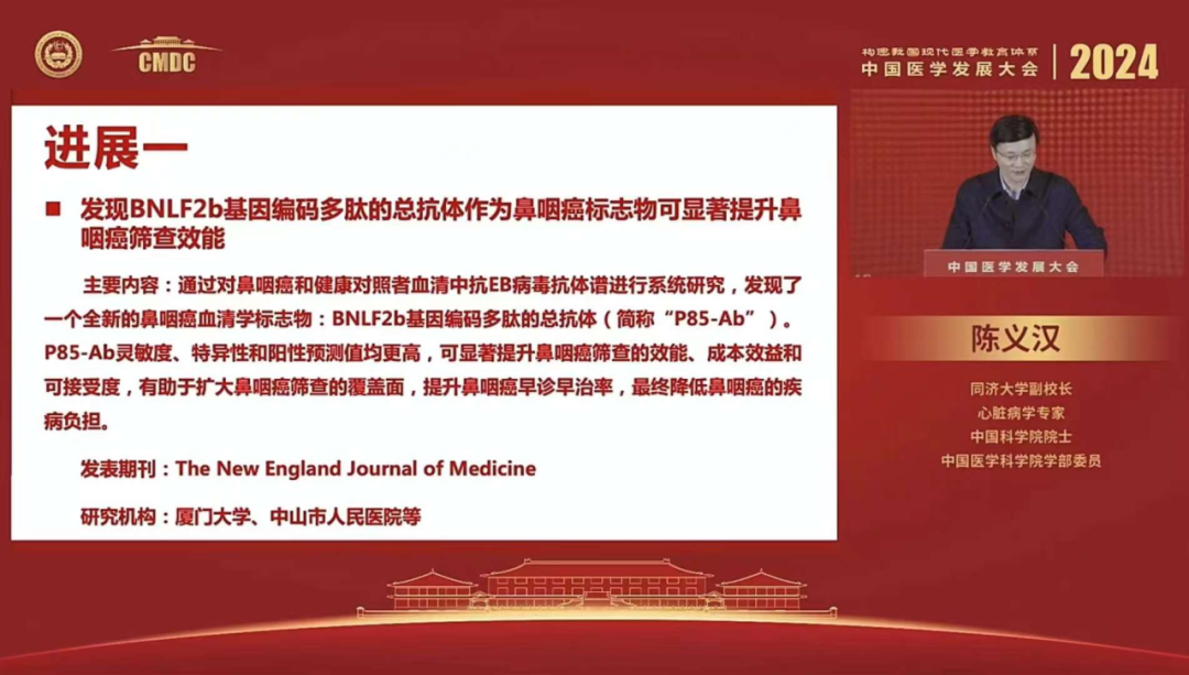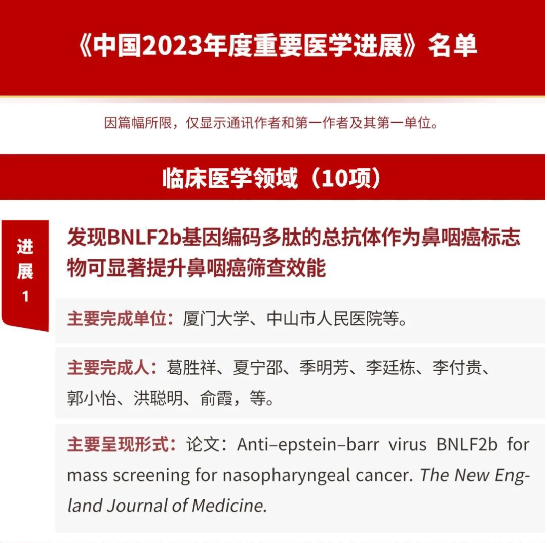 4月21日,中国医学科学院在2024年中国医学发展大会上发布了《中国21世纪重要医学成就》和《中国2023年度重要医学进展》的评选结果,其中由厦门大学、中山市人民医院、北京万泰生物药业股份有限公司联合开展的“发现BNLF2b基因编码多肽的总抗体(简称“P85-Ab”)作为鼻咽癌标志物可显著提升鼻咽癌筛查效能”入选《中国2023年度重要医学进展(临床医学领域)》并排第一位!