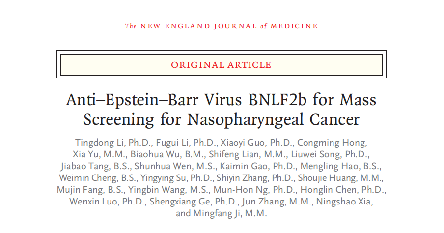 [2] Li, Tingdong, Fugui Li, Xiaoyi Guo, Li, Tingdong et al. “Anti-Epstein-Barr Virus BNLF2b for Mass Screening for Nasopharyngeal Cancer.” The New England journal of medicine 389 9 (2023): 808-819.