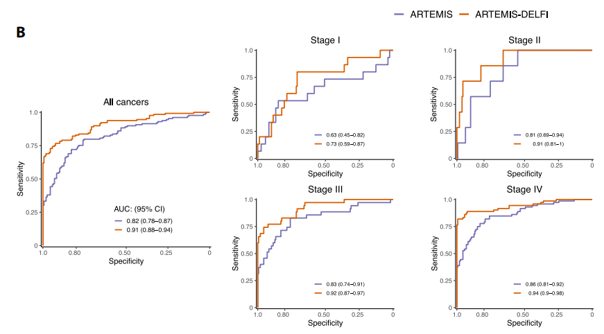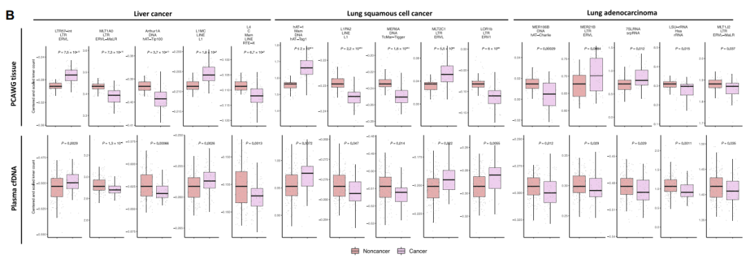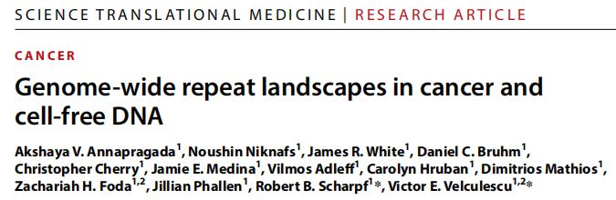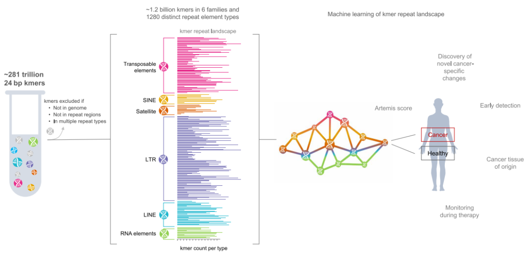 基因组重复序列包含了人类基因组的一半以上,主要由串联重复序列和逆转录转座子组成。串联重复序列,如人类卫星DNA;逆转录转座子包括LINEs、SINEs、LTRs和其他转座元件。长期以来,重复序列的改变一直与癌症的发展有关。在癌症中,整体低甲基化可驱动转座元件移动,导至癌基因激活和基因组不稳定。串联重复序列在拷贝数变异区域的断点上富集,而Alu重复序列在缺失和重复断点上富集。上述重复元件的变化是癌症基因组的广泛特征。 随着液体活检技术的发展,重复序列的分析已经开始在cfDNA中进行。最近,逆转录转座子和非端粒卫星DNA已被用于评估cfDNA的总体数量或非整倍性。但尚未对任何人类癌症的组织或cfDNA中的重复序列进行系统分析,这主要是因为无法以全基因组的方式识别和量化重复序列。 近日,约翰·霍普金斯大学在杂志Science translational medicine上发表了一篇题为“Genome-wide repeat landscapes in cancer and cell-free DNA”的文章。作者开发了一种名为ARTEMIS(疾病重复元件分析)方法,用于分析短读序列中的重复图谱。结果表明,在人类癌症中,重复序列景观发生了广泛的改变。重复元件在癌症中常见改变的基因区域中富集,在cfDNA中可检测到重复图谱的变化,并可用于检测和监测癌症,以及识别肿瘤的组织来源。 图片来源:Science translational medicine 主要内容 ARTEMIS方法概述。 对kmer的从头鉴定揭示了大约12亿个独特的kmer,覆盖1280种不同的重复元件。这些重复元件代表六个家族:转座元件、SINEs、卫星、LTRs、LINEs和RNA元件。在单个样本中,kmers重复图谱被定义为包含所有reads中识别的每种重复类型的所有kmers的总和,并按coverage归一化。kmers重复图谱被用于机器学习,以生成用于疾病表征和预测的ARTEMIS评分。 ARTEMIS方法概述。 图片来源:Science translational medicine 癌症相关基因和通路中 重复kmers的全基因组富集 首先研究了独特重复类型的12亿kmers的全基因组分布,发现重复元件在人类癌症中普遍改变的基因中富集。在736个COSMIC癌症驱动基因中,有487个基因的外显子或内含子序列中重复kmer序列的数量高于预期,这些区域的重复kmer平均增加了15倍。重复kmer序列在癌症中常见的失调通路中也显著增加,包括细胞粘附、生长和信号通路,以及癌症类型特异性基因集。 Kmer重复序列景观在癌症基因组中发生了改变 作者使用短读NGS评估了癌症中kmer重复景观是否发生了改变。作者分析了525例患者,包括乳腺、肺、结直肠、肝脏、甲状腺、头颈部鳞状细胞、卵巢、胃、膀胱、宫颈或前列腺癌症,并确定肿瘤中特定重复元件类型的全基因组kmer计数是否发生改变。结果显示,与匹配的正常组织相比,肿瘤中有中位数807个重复元件的kmer计数增加或减少。近三分之二改变的重复元件以前没有在癌症中被观察到发生改变。此外,kmer重复景观变化较多的肿瘤具有更高的染色体不稳定性,这反映在整体基因组熵、杂合性缺失等全基因组结构变化指标。 525个样本重复元件的位置和肿瘤序列断点分析结果显示,有215种元件富集在断点位置,包括LINEs,SINEs,LTRs,转座元件和RNA元件,表明这些元件可能在促进这些结构变化中发挥作用(图B)。总的来说,这些分析突出了kmer重复景观检测和表征人类癌症中各种结构变化的能力。 重复元件富集在肿瘤序列断点位置。 图片来源:Science translational medicine Kmer在cfDNA中重复序列景观 作者下一步尝试确定是否可以使用低覆盖率的cfDNA测序来量化血浆中的重复序列。结果显示,与非癌症个体的血浆相比,肺鳞癌或腺癌或肝癌患者的血浆中观察到的许多重复kmer的增加或减少明显(图B)。不仅包括已知在癌症中起作用的元件,如LINE L1,还包括新发现,如DNA-hAT-Charlie和LTR ERV1、ERVLMaLR和ERVL。 Kmer在癌症患者cfDNA中重复序列景观。 图片来源:Science translational medicine ARTEMIS kmer重复图谱分析 用于癌症检测和监测 作者通过kmer重复图谱使用机器学习模型检测丹麦肺癌筛查研究队列(n = 287)中的肺癌以及高危人群中的肝癌(n = 208)。ARTEMIS分类肺癌患者AUC为0.82,当联合DELFI全基因组碎片特性,ARTEMIS-DELFI联合模型分类肺癌患者AUC为0.91(图B)。ARTEMIS在肝硬化或病毒性肝炎患者中分类肝癌的AUC为0.87,联合DELFI后,AUC提高到0.90。 最后,作者评估了ARTEMIS是否有助于确定肿瘤组织或cfDNA样本来源。训练一个机器学习模型利用kmer重复景观区分组织类型,12肿瘤类型中分类肿瘤的组织起源的准确率在78%。将这种方法扩展到cfDNA,ARTEMIS-DELFI正确地将不同癌症类型的检测患者进行了分类,平均准确率为68%。 ARTEMIS kmer重复图谱分析用于癌症检测。 图片来源:Science translational medicine 总结与讨论 作者开发了一种名为ARTEMIS方法,用于从全基因组测序中识别重复元件。使用这种方法,作者在癌症患者中发现了1280种重复元件类型的肿瘤特异性变化。重复元件在驱动基因区域富集,可能为癌症中染色体的结构改变和基因组不稳定性提供了潜在的基础。在交叉验证和外部验证的队列中,对全基因组重复序列和cfDNA片段图谱进行机器学习分析可检测到早期肺癌或肝癌患者。此外,重复图谱可以用来无创地识别肿瘤的起源组织。这些分析揭示了人类癌症重复图谱的广泛变化,并提供了一种检测和表征癌症的方法,这可能有利于癌症患者的早期检测和疾病监测。 但研究也有一些局限性。虽然在外部验证了ARTEMIS的癌症检测,但在