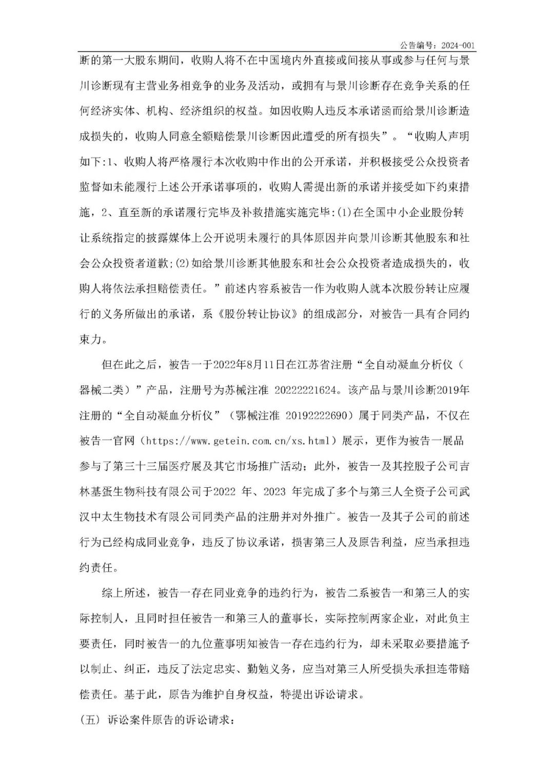 4月23日,新三板挂牌企业景川诊断发布公告,公司中小股东武汉众聚成咨询管理有限责任公司作为原告,对公司控股股东基蛋生物及其9位董事发起民事诉讼,希望法院依法确认基蛋生物与景川诊断之间存在同业竞争行为,并要求基蛋生物立即停止同业竞争行为。从景川方描述来看,是发现基蛋生物自己注册的全自动凝血分析仪和景川诊断的产品属于同类产品,在当初的某一份约定中违反了约定,所以景川要求基蛋停止同业竞争、道歉、赔偿经济损失,希望法院能够确认同业竞争行为。(具体事情的真实情况,需要结合基蛋后续的回应综合来看。) 2020年,基蛋生物公告收购武汉景川诊断54.9624%的股份,收购总价款为63,910,265.04元人民币;股份转让完成后,公司拟按照3.42元/股的价格认购景川诊断新增股份,认购金额为10,000,080.00元。本次交易完成后,基蛋生物将持有景川诊断58.5289%的股份。收购及增资后,景川诊断成为公司控股子公司,并纳入公司合并报表范围。通过景川诊断,公司将进入凝血检测的行业细分领域,开拓公司凝血检测业务板块。双方在去年8月层发过一次诉讼。起因是景川要求基蛋完成对股东剩余股份的收购。双方对收购事宜未达成一致。基蛋并未认可,并在11月反诉景川诊断要求解除收购剩余股份的约定。此事后来并无新进展。此次景川再次发难,应该是通过这一行为再次向基蛋施加压力。 截止目前,对于此次诉讼,基蛋生物尚未公开回应,文末公告为景川单方面的陈述。 现在来看,IVD企业之间并购也是一个很复杂的事情,收购完成整合是一方面。另外还可能面对利益的问题一地鸡毛的司法纠纷,昔日合作伙伴变仇人,一声叹息。