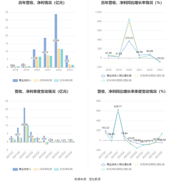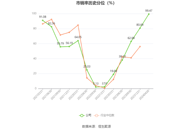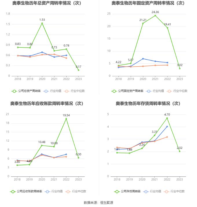 奥泰生物表示,2020年至2022年,公司经营业绩大幅增长主要来源于新冠检测产品销售相关业务的突发增长,未来公司的整体经营业绩与新冠疫情期间相比面临销售业绩大幅度下滑的风险。 分产品来看,2023年公司主营业务中,传染病类收入2.75亿元,占营业收入的36.48%;毒品及药物滥用类收入2.04亿元,占营业收入的27.00%;新冠检测类收入0.89亿元,占营业收入的11.80%。 以4月26日收盘价计算,奥泰生物目前市盈率(TTM)约为32.93倍,市净率(LF)约为1.55倍,市销率(TTM)约为7.88倍。 公司近年市盈率(TTM)、市净率(LF)、市销率(TTM)历史分位图如下所示: 数据统计显示,奥泰生物近三年营业总收入复合增长率为-12.73%,在体外诊断行业已披露2023年数据的29家公司中排名第23。近三年净利润复合年增长率为-35.70%,排名20/29。 截至2023年末,公司员工总数为1093人,2022年员工总数为1244人,减员151人,2023年人均创收69.05万元,人均创利16.52万元,人均薪酬15.53万元,较上年同期分别下降74.65%、82.66%、0.80%。 2023年,公司毛利率为48.78%,同比下降11.15个百分点;净利率为23.89%,较上年同期下降11.09个百分点。从单季度指标来看,2023年第四季度公司毛利率为51.28%,同比上升24.16个百分点,环比上升0.42个百分点;净利率为40.58%,较上年同期上升86.89个百分点,较上一季度上升22.90个百分点。 分产品看,传染病类、毒品及药物滥用类、新冠检测类2023年毛利率分别为45.35%、61.13%、54.81%。 报告期内,公司前五大客户合计销售金额1.46亿元,占总销售金额比例为19.38%,公司前五名供应商合计采购金额0.48亿元,占年度采购总额比例为29.24%。 数据显示,2023年公司加权平均净资产收益率为4.52%,较上年同期下降27.12个百分点。公司2023年投入资本回报率为3.68%,较上年同期下降26.89个百分点。 2023年,公司经营活动现金流净额为2476.37万元,同比下降98.18%;筹资活动现金流净额-5.59亿元,同比减少1.97亿元;投资活动现金流净额-1.41亿元,上年同期为-12.64亿元。 进一步统计发现,2023年公司自由现金流为-2.16亿元,上年同期为0.35亿元。 2023年,公司营业收入现金比为103.30%,净现比为13.71%。 营运能力方面,2023年,公司公司总资产周转率为0.17次,上年同期为0.78次(2022年行业平均值为0.60次,公司位居同行业13/38);固定资产周转率为3.02次,上年同期为19.41次(2022年行业平均值为5.40次,公司位居同行业4/38);公司应收账款周转率、存货周转率分别为6.30次、2.02次。 2023年,公司期间费用为1.99亿元,较上年同期减少1.66亿元;但期间费用率为26.30%,较上年同期上升15.54个百分点。其中,销售费用同比下降53.91%,管理费用同比下降14.7%,研发费用同比下降41.55%,财务费用由去年同期的-7092.70万元变为-5853.55万元。 资产重大变化方面,截至2023年年末,公司在建工程较上年末增加1054.30%,占公司总资产比重上升10.96个百分点;货币资金较上年末减少33.52%,占公司总资产比重下降10.20个百分点;交易性金融资产较上年末减少19.72%,占公司总资产比重下降3.29个百分点;其他流动资产较上年末增加536.78%,占公司总资产比重上升1.29个百分点。 负债重大变化方面,截至2023年年末,公司合同负债较上年末减少71.73%,占公司总资产比重下降2.13个百分点;应付账款较上年末减少54.66%,占公司总资产比重下降1.76个百分点;应交税费较上年末减少23.54%,占公司总资产比重下降0.29个百分点;其他流动负债较上年末减少98.58%,占公司总资产比重下降0.24个百分点。 从存货变动来看,截至2023年年末,公司存货账面价值为1.89亿元,占净资产的4.93%,较上年末减少506.51万元。其中,存货跌价准备为5357.36万元,计提比例为22.F。 2023年全年,公司研发投入金额为1.21亿元,同比下降41.55%;研发投入占营业收入比例为16.06%,相比上年同期上升9.94个百分点。 年报称,2023年度,公司新增授权专利/软件著作权共37项,其中发明专利1项,实用新型专利18项,外观设计专利16项,软件著作权2项。截至2023年底,公司累计获得授权专利/软件著作权158项,其中发明专利29项、实用新型专利65项、外观设计专利60项和软件著作权4项。 在偿债能力方面,公司2023年年末资产负债率为6.91%,相比上年末下降4.26个百分点;有息资产负债率为0.39%,相比上年末上升0.21个百分点。 2023年,公司流动比率为11.53,速动比率为10.84。 年报显示,2023年年末公司十大流通股东中,新进股东为上证红利交易型开放式指数证券投资基金、国泰致远优势混合型证券投资基金、招商银行(34.480, 0.08, 0.23%)股份有限公司-国泰价值优选灵活配置混合型证券投资基金(LOF)、香港中央结算有限公司,取代了三季度末的国泰佳泰价值平衡股票型养老金产品-中国建设银行(7.120, -0.12, -1.66%)股份有限公司、姜正金、宓莉、国泰医药健康股票型证券投资基金。在具体持股比例上,宁波文叶创业投资合伙企业(普通合伙)、国泰江源优势精选灵活配置混合型证券投资基金持股有所上升。 筹码集中度方面,截至2023年年末,公司股东总户数为5949户,较三季度末下降了1647户,降幅21.68%;户均持股市值由三季度末的64.39万元上升至91.42万元,增幅为41.98%。 指标注解: 市盈率=总市值/净利润。当公司亏损时市盈率为负,此时用市盈率估值没有实际意义,往往用市净率或市销率做参考。 市净率=总市值/净资产。市净率估值法多用于盈利波动较大而净资产相对稳定的公司。 市销率=总市值/营业收入。市销率估值法通常用于亏损或微利的成长型
