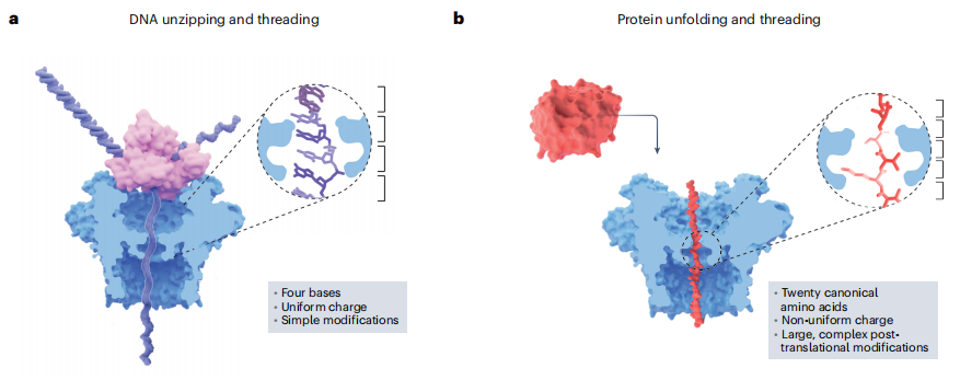 纳米孔核酸测序激发了类似的无标记蛋白质分析。然而,多肽的纳米孔测序比DNA和RNA链更具挑战性。首先,蛋白质测序在分析上更为复杂,需要区分20个典型氨基酸以及数百个非蛋白质氨基酸,包括许多翻译后修饰,而DNA测序通常只读取4个碱基。此外,蛋白质的复杂折叠阻碍了多肽链通过纳米孔。另一个问题是缺乏类似于核酸聚合酶链反应(PCR)的蛋白质扩增方法。最后,蛋白质拷贝数的动态范围可以从每个细胞1到107个拷贝,远远高于DNA。