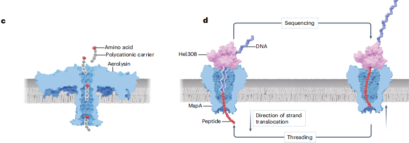 早期读取肽的努力集中于检测单个氨基酸。一项研究中,几乎所有的氨基酸都被离子电流扰动来区分。目标氨基酸与短的带正电荷的载体肽相连,通过纳米孔易位(图c)。易位速度足够慢,甚至可以区分结构相似的亮氨酸和异亮氨酸残基。