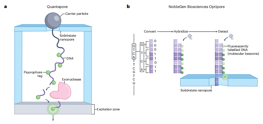 显然,基于纳米孔的DNA测序可以通过多种方法来进行。不同来源的纳米孔可以捕获单链,测序可以依赖于直接阅读链碱基,通过边合成边测序跟踪互补链的聚合,通过破译外切酶生成的标记或核苷酸,或通过标记DNA的映射。读出可以基于离子电流、隧穿电流或荧光。其中一些方法可能会指导蛋白质测序的未来发展。