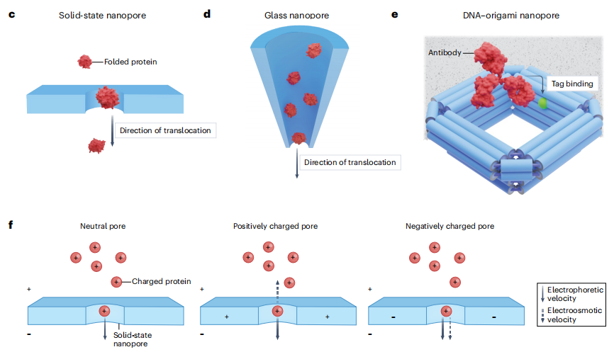 与纳米孔的类型和大小无关,折叠蛋白质的捕获和运输通常通过电渗(图f)而不是电泳,在电渗作用中,当小电解质离子以及其周围水壳被电泳驱动穿过水孔腔时,蛋白质被水流带动运输。蛋白质通常会太快地通过大直径的纳米孔,而无法检测。要减缓蛋白速度,可使用“大分子拥挤”纳米孔,带电腔壁,分析物吸附coating,分子识别标签,空间阻塞纳米球,DNA纳米载体引导蛋白质穿孔的固态孔多重传感。其中一些方法可以检测蛋白质的不同形状和体积以及蛋白质进入孔的方向。