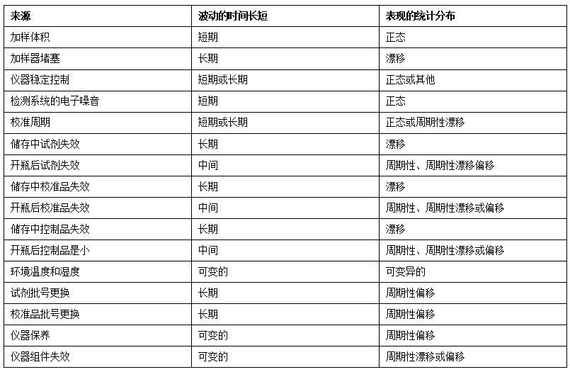 Tietz 第7版的QC介绍(五) 1 依据安排检测质量控制样品 实验室操作典型地实施了两个类型的检测安排。批量处理检测一组临床样品,作为一批,在报告结果前完成了所有样品的检测。作为批过程,QC样品可以与病人样品一起检测,例如,多孔反应板,或在检测顺序系列的开始和最后检测,确保所有结果在报告前是正确的。 连续检测过程在较多样品场合下很常见,例如,自动化学分析仪或血液学分析仪,在病人样品被检测时,连续地报告结果,由于实验室在整个过程中定期地对QC样品检测。使用连续检测系统中,安排了如实施重新校准或保养,确保检测情况连续符合规范,和纠正了任何校准漂移或发生了成分失效。在这样安排做法前,检测了QC样品,可以让实验室证实,从检测了最后时间的QC样品以来,在结果中没有发生显著误差。如果,QC样品在这样安排中没有监护问题,实验室将不知道,是否报告了病人样品有差错的结果,自从最后的QC样品检测的时间,和安排的开始。 实验室主任使用了风险评估方式去确定,在实施进度前,何时应监测QC样品。例如,每天清理程序被预期保养检测系统处于良好的工作情况下,在出现事件前部要求QC评估。相反,一个保养事件,替换了将产生一个改变的检测系统,在事件前的QC评估仅是去确定,在事件前最后可接受的QC结果起,没有报告有差错的结果。在安排情况后应检测QC样品,去证实实施的操作是正确的,在重新开始检测病人样品前,检测程序性能符合了规范。 在连续检测过程中发生了故障,以至检测系统不可运行,该情况必须处理,由于一次QC失败,接着重复和确认已经报告的病人样品结果。要求有跟进措施,因为故障阻碍了检测QC样品,去确定是否从最后可接受QC评估以来,报告了有差错的结果。 2 建立质量控制靶值和标准差 代表了一个稳定的检测操作情况 建立QC靶值和可接受性能限值,使具有最适的可能性去检出一个足够大的检测失败,具有对临床诊疗决定的影响,同时消除了因用于评价QC结果指标统计局限性的“假性报警”。在统计参数被确定去建立QC的解释规则前,检测系统必须被正确地校准和操作,并在可接受的性能指标之内。在检测程序正常运行中,预期会发生一些检测变异的来源,可参见表6-2。检测变异包括在短时间内频繁发生的、许多变异呈正态误差分布,和中间和较长的时间区间的来源,可引起几天或数周内循环波动,在数周或数月的逐渐偏移、和结果中间歇性的突然小的偏移。用于QC解释规则的SD需要合适地代表结果中所有来源的变异,在检测程序按照指标实施的时间内预期发生的。(见表6-2)。 表6-2 检测变异性的常见来源 3 质量控制物质的靶值 一个QC物质必须具有可靠的靶值,代表系统尽可能小的偏移情况。这个条件要求检测程序被正确地校准。由于实际原因,包括检测变异的典型来源,将确保这个代表性的均值有数据计算而来。在实际情况下,表6.2的变异来源不代表及时可用下去建立靶值。因此,靶值具有不确定度,在检测条件波动下、随着时间的推移,要改善以反映预期的可变性。 靶值设定的一般可接受最低方案是,使用至少在不同的10天内检测得到的10个检测值的均值。在较长的时间区间内进行10次更多次检测,去包括估计靶值中其他重要的变异来源; 若可行,该10个检测值应代表多次校准,包括在靶值变异的来源中。在一个较长时间区间内进行了10次或更多次的检测,在均值估计中包括了其他重要的变异来源。如果QC物质使用超过1天,控制品应正确储存,并在物质准备用的许多天内检测,包括开瓶储存下引入的变异性,被包括在均值中。如果一个10天的方案不可能(如,如果一批QC物质的紧急更换是必须的),在几天内以少量数据建立一个临时靶值,但应在更多的重复结果可用下给予更新。 因为所有变异的来源不可能在10次检测中获取,在使用QC物质期间,建议有更多数据后去更新靶值。靶值也在试剂批号更换或其他检测条件改变下需要更新。在以后的试剂批号改变后内容中叙述的确认质量控制评价参数内容。 4 质量控制物质的标准差 SD是表达检测程序变异性的传统方式,并假设QC数据可以呈正态分布,尽管变异的非正态成分影响了QC结果。仪器的和实验室计算机系统的统计QC包,被设计为假设,正态分布的SD被用于QC规则的指标。因为检测变异性在整个时间内有非正态分布的成分,非常重要的是,它们被代表了用于估计SD的数据中,被用于作出结论,关于某个QC值的可接受性。所以SD必须是越真实越好,代表某检测程序在它的性能符合它的指标下预期的变异性。 当实验室确定了一个检测程序,引入了一个新批号的QC物质,新批号QC物质的靶值被与以往很好建立的以往批号的长期SD一起使用。这个做法因为在大多情况下,检测的不精密度是检测程序和使用的设备的一个性质,在改变不同批号QC物质时不像会改变。较少次数重复检测的SD,不应用于新批号的QC物质,因为它没有包括大多的变异来源,将低估了SD,因此引起失败的QC规则假阳性。在引用不同厂商的新批号QC物质时,有可能观察到的SD与以往值不同,因为基质差异,作为经验应监视和调整SD。如果新老批号的QC物质的靶值确实有差异,则需要一个不同的SD。假设在不同靶值浓度间的差异内,CV大致上是恒定的,则SD可以应用现有的CV为新靶值计算SD,然后转换为相应的SD值。因为有可能SD受一个批号QC物