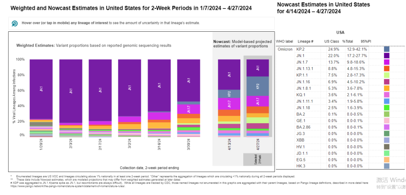 美国疾控中心最新数据显示,目前,KP.2占美国感染病例的四分之一以上。截至5月11日的两周内,KP.2估计占美国病例的28.2%,高于4月中旬的约6%和3月中旬的仅1%。