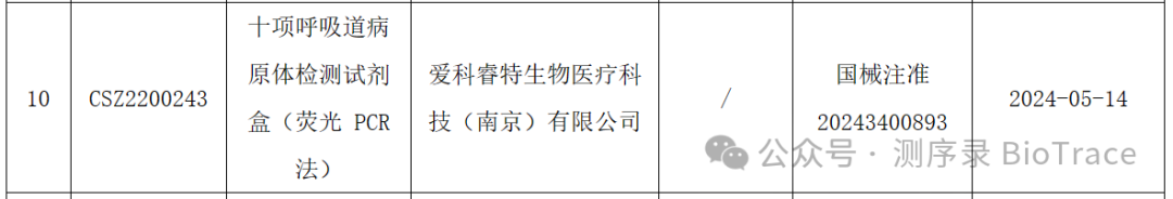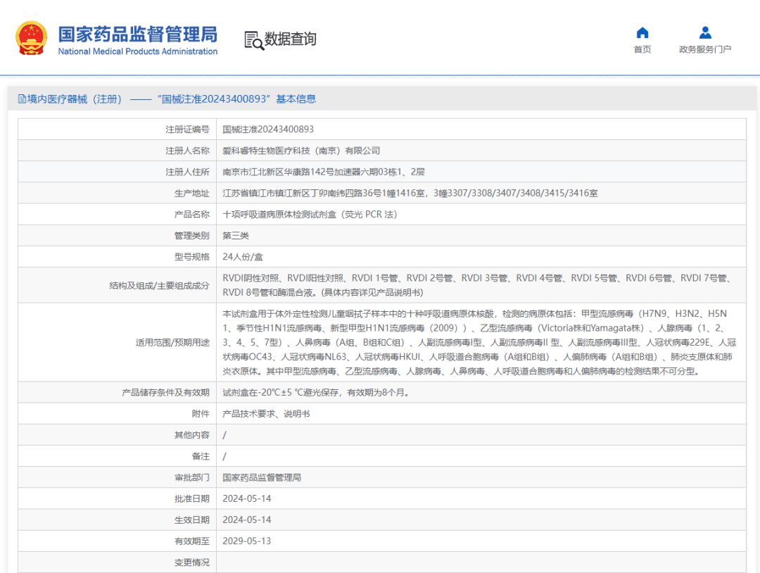 5月14日,爱科睿特生物医疗科技(南京)有限公司十项呼吸道病原体检测试剂盒(荧光 PCR 法)正式获得国家药品监督管理局颁发的医疗器械注册证 (国械注准:20243400893)。从国家药监局公布的信息来看,该试剂盒用于体外定性检测儿童咽拭子样本中的十种呼吸道病原体核酸,检测的病原体包括:甲型流感病毒(H7N9、H3N2、H5N1、季节性H1N1流感病毒、新型甲型H1N1流感病毒(2009))乙型流感病毒(Victoria株和Yamagata株)、人腺病毒(1、2、3、4、5、7型)、人鼻病毒(A组、B组和C组)、人副流感病毒I型、人副流感病毒II 型、人副流感病毒III型、人冠状病毒229E、人冠状病毒OC43、人冠状病毒NL63、人冠状病毒HKUI、人呼吸道合胞病毒(A组和B组)、人偏肺病毒(A组和B组)、肺炎支原体和肺炎衣原体。其中甲型流感病毒、乙型流感病毒、人腺病毒、人鼻病毒、人呼吸道合胞病毒和人偏肺病毒的检测结果不可分型。