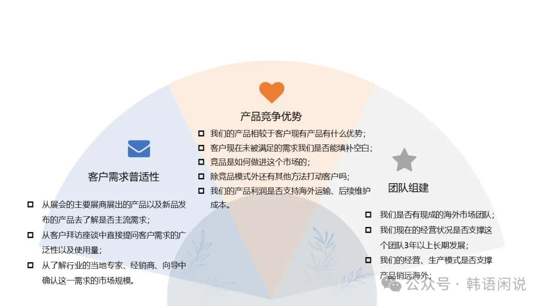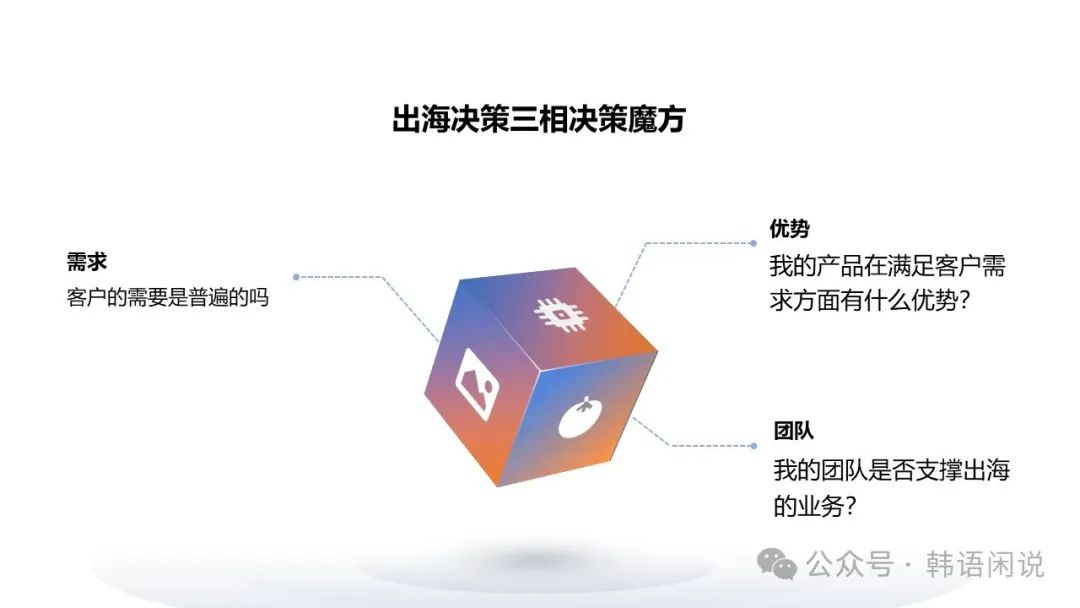 这在里面,笔者是推荐“关键人物”的“出海”考察之旅以国际性展会观展为起点,最好附带潜在客户现场调研、会谈,既能看到行业发展趋势,也能亲身感受客户需求与痛点,从而为“出海”决策提供理性与感性支持依据。一次海外之行未必能了解所有信息,但是至少可以关注三个方面的问题,笔者把这三个问题称为“出海决策三相决策魔方”: