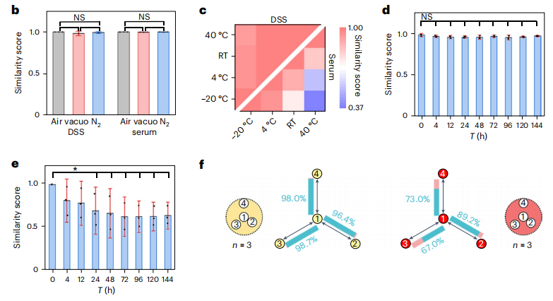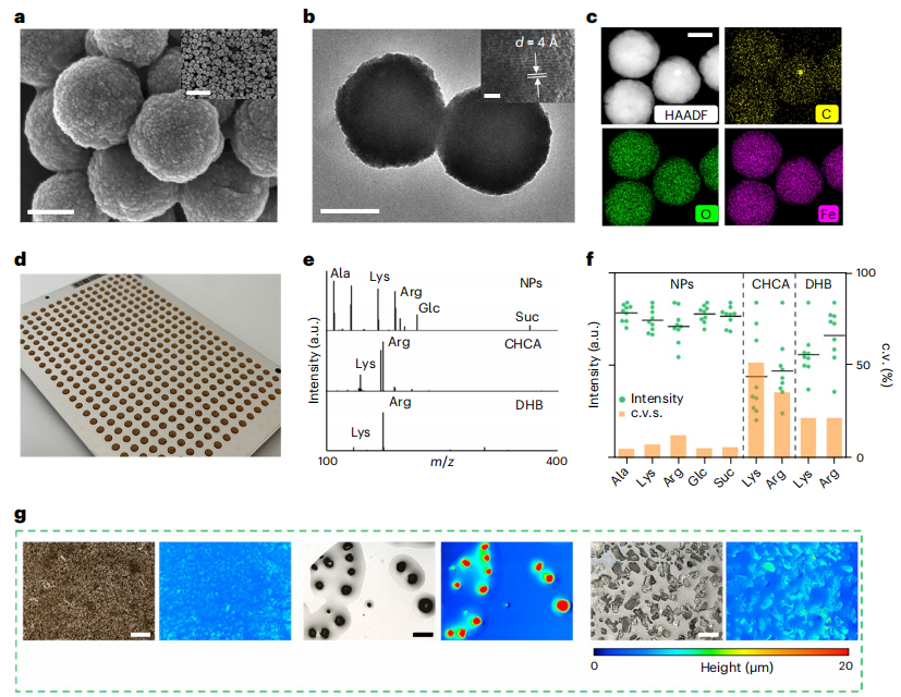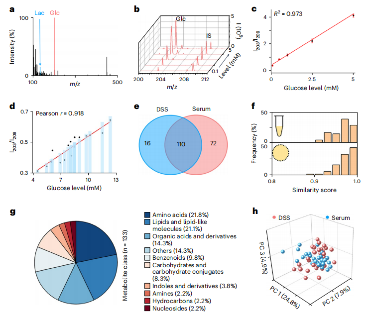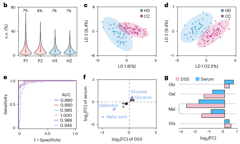 以人群为基础的诊断可导至更高的生存率、更低的发病率和更低的医疗保健费用,特别是癌症等疾病。然而,由于缺乏高准确性和可负担性的诊断工具,导至未确诊病例的比例很高,特别是在中低收入国家。由于无需大容量样本载体(如采血管)、苛刻储存条件以及冷链运输,干血点标本(DSS)领域最近得到发展,利于在中心实验室集中检测。 目前,干血点试验已经证明在代谢研究中取得了大规模的成功,覆盖了发达国家95%以上的新生儿筛查先天性代谢疾病。蛋白质在干血点的过程中很容易灭活和降解,远远不足以检测癌症分析物。相比之下,大多数代谢物在干血点上保持稳定。代谢诊断可以识别癌症代谢异常的个体,特别是在欠发达地区。 近日,杂志Nature sustainability上发表了一篇题为“A sustainable approach to universal metabolic cancer diagnosis”的文章。作者提出了一种结合干血清斑(DSS)和纳米粒子增强激光解吸/电离质谱(NPELDI MS)来检测代谢物的诊断方法,可在几分钟内以低成本,环境友好,血清等效精度和用户友好的方法诊断多种癌症。这项工作为提供更可持续的代谢诊断和最大的健康收益提供了见解。 图片来源:Nature sustainability 主要内容 NPELDI MS平台 为了敏感、特异和可重复的代谢检测,作者首先检测了传统LDI MS平台中使用的有机基质DHB,但效果不理想。作者尝试应用无机纳米颗粒来替代有机基质(图a-c)。通过将铁系纳米颗粒分布在不锈钢靶板上,构建了可并行检测384个样本的多路代谢物微阵列(图d)。 灵敏度检测结果显示,检测限低至0.07μM。且特异性检测结果表明,铁纳米颗粒从复杂生物标本中直接提取代谢物有尺寸效应,表明NPELDI MS对代谢物具有选择性。不仅如此,实验结果还表明NPELDI MS的数据具有可重复性,变异系数(c.v.)<13%(图f)。数据的稳定性归因于代谢物和铁NPs之间的均匀共结晶(图g)。 NPELDI MS平台。图片来源:Nature sustainability 可行性分析 作者下一步旨在了解从DSS中提取的代谢物是否可以使用NPELDI MS进行可靠的定量和分析。作者选择葡萄糖和乳酸作为指标,观察到NPELDI MS的检测(图a)中指示分子的峰值强度的变化,分别对应于代谢物浓度0.10-5mM和0.05-5mM。相比商业生化试剂盒,重复性相似,但节约了10倍样本体积及检测时间。 进一步的评价结果显示,DSS提取物与血清样本中的代谢物定量呈线性相关,葡萄糖的Pearson相关性为0.918,乳酸的相关性为0.925(图d)。对于非靶向代谢谱,作者比较了从配对的DSS和血清样本中获得的光谱一致性。共检测到198个MS峰,与133种代谢物相匹配,涵盖了各种生化指标(图g)。其中110个(55.6%)MS峰在DSS和血清都能检测到(图e)。大多数MS峰在至少有80%的样本中都能检测到(图f),表明从配对的DSS和血清样本中获得的代谢谱的一致性。 这些结果表明,来自DSSs的代谢物允许其用于疾病诊断的分类任务。 可行性分析。图片来源:Nature sustainability DSS样本不同存储条件对检测的影响 作者还测试了DSS样本在不同存储条件和穿孔取样位置对代谢谱检测的影响(图a)。 DSS样品在不同存储环境如空气中,真空和纯N2存储6h后代谢谱表现出较高的稳定性,检测结果与血清样本相似。DSS和血清样本之间相似性得分为:空气为0.729 ± 0.013,真空为0.734 ± 0.011,纯N2为0.754±0.035(图b)。DSS样品在不同的存储温度如−20°C、4°C、r.t.和40°C的空气中保存6小时后,表现出代谢谱对环境热变化具有良好的抗性,相似性得分超过0.93(图c)。相比之下,血清中的非靶向代谢谱随着温度变化而显著波动。DSS在空气中6天内连续记录非靶向代谢谱。在不同存储时间下,代谢谱变化很少,平均相似度得分均超过0.95(图d)。相比之下,与0 h相比,血清样本保存144 h的相似性得分显著下降到0.634(图e)。 DSS样本不同存储条件对检测的影响。 图片来源:Nature sustainability DSS样本不同穿孔取样位置对检测的影响 作者在同一DSS内的4个不同位置进行了3次重复的代谢谱分析(上图f),结果显示从DSS中提取的代谢物含量不依赖于一定的穿孔位置。相比之下,从全血样本中制备的干血点(DBS),DBS的不同冲孔位置和中心区域在两者之间观察到明显的变异性,可能归因于当细胞和血浆成分分离时,分析物浓度在不同元素之间的分布不均匀。 DSS代谢谱进行癌症诊断 作为概念验证,作者分析了180例DSSs的非靶向代谢谱。与血清样本相比,从DSS中获得的非靶向代谢谱产生了一致的读数,并显示出相当的鉴别能力(图c、d),证实了非靶向DSS代谢谱的潜在诊断能力。DSS衍生的模型来区分癌症患者,受试者工作特征曲线下面积(AUROCs)训练集为0.841–0.993,验证集为0.900–1.000(图e)。 接下来,作者将所有图谱作为机器学习的输入,并确定了健康人群(HD)与不同癌症组之间存在显著差异的代谢物(图f)。在DSS和血清模型中,有2种共同上调和2种共同下调的代谢物,并建立了三个分类器,以AUROC 0.750/0.924/0.986区分PC/GC/CC组和HD组(图e)。总的来说,这些发现证明了DSS代谢分析在发现生物标志物方面的潜力。 DSS代谢谱进行癌症诊断。 图片来源:Nature sustainability DSS代谢诊断的可持续性和经济评价 确保疾病的可持续诊断已引起全球越来越多的关注。成本效益是疾病筛查的关键。NPELDI质谱方法的特点是直接的代谢分析,不需要样品预处理,允许提高分析速度(~秒)。相比之下,传统的代谢分析方法需要繁琐的样品预处理,如色谱串联质谱(每批96个样品1-8小时)和核磁共振(每批96