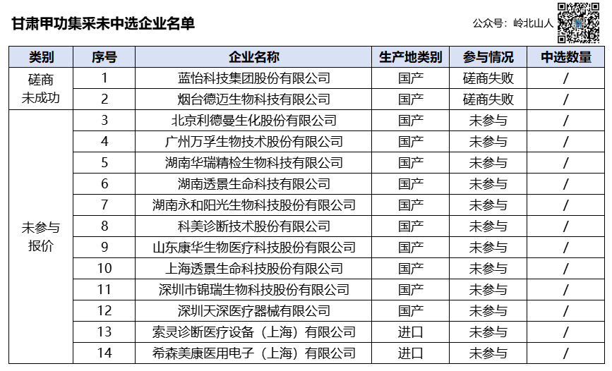 来源:甘肃省招采子平台 整理:岭北山人 如出现非整数则向上取整至个位,为本企业产品的协议采购量 4、剩余意向需求量或未中选企业意向需求量由医疗机构在中选企业中自行选择 根据最终公布的数据显示,一共有60个厂家的475个产品中选。从数量上看,新产业排名第一,亚辉龙排名第二,爱康和威高排名第三,均按规则一中选。 按分量规则来看,规则一中选的产品,无需二次分量,需求量全部保留。而按规则一中选的企业一共有30家,这30家企业的医疗机构需求量,将全部保留,而且这些企业,具有二次分量资格。清单如下: 按规则二中选的产品,保留50%的需求量,另外50%需要进行二次分量。按第二中选规则中选的企业,同样有30家,这部分的需求量,将会有一半需要进行二次分配。同样,这30家企业,也具有二次分量资格。 对于未中选企业的需求量,则全部拿出来进行二次分配,其中不乏进口和国产大企业。 此外,为配合此次甲功带量采购分量工作,甘肃医保局招采子平台系统进行升级,以下是关于v2.0.14版本升级更新通知: 1、甲状腺功能检验试剂带量采购二次分量功能上线 2、关闭企业端“耗材招标管理/国家耗材代码维护”、“耗材招标管理/国家试剂代码维护”、“耗材招标管理/维护全国价格”菜单页面。维护国家医保分类代码、维护全国价格请在“耗材招标管理/耗材基础库管理/产品管理(新增)/产品规格型号列表”菜单页面操作 3、“耗材招标管理/耗材动态调整/价格调整申报模块”,无挂网价的耗材产品,不允许常态化降价或者价格勘误 4、优化耗材基础库产品申报页面,修复已知BUG |