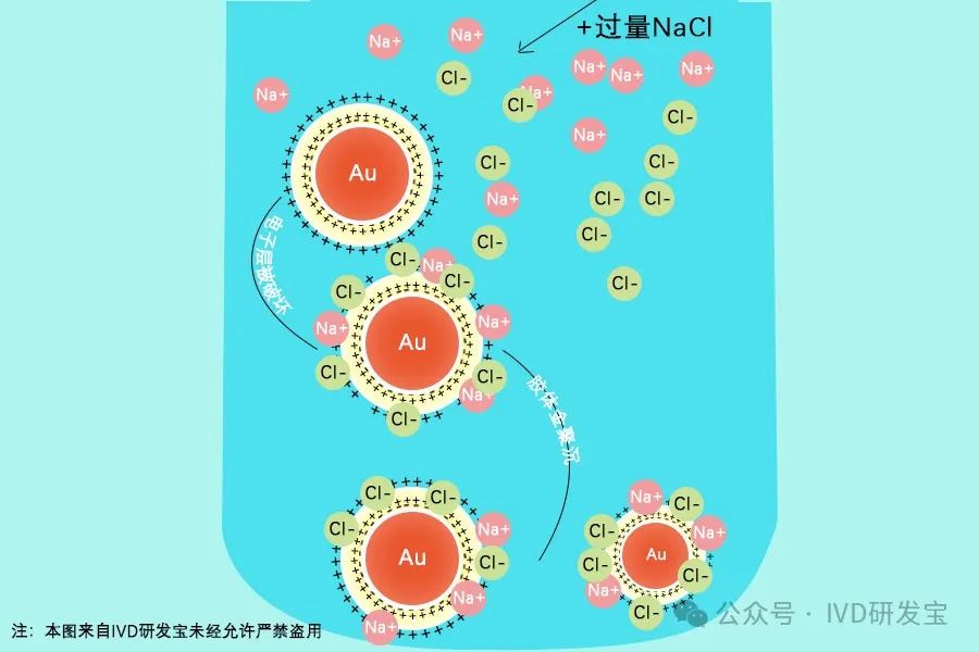 PH导至聚集:我的表面电荷密度容易受 pH 值影响发生改变。特定 pH 条件下,胶体金颗粒表面的电荷与溶液中的离子电荷相互作用,导至静电排斥力增加或减少。通常来说,在靠近其等电点(pH 等于颗粒表面点电荷的 pH)时,静电排斥力最小,颗粒之间的吸引力会增加,从而增加胶体金的聚集倾向。