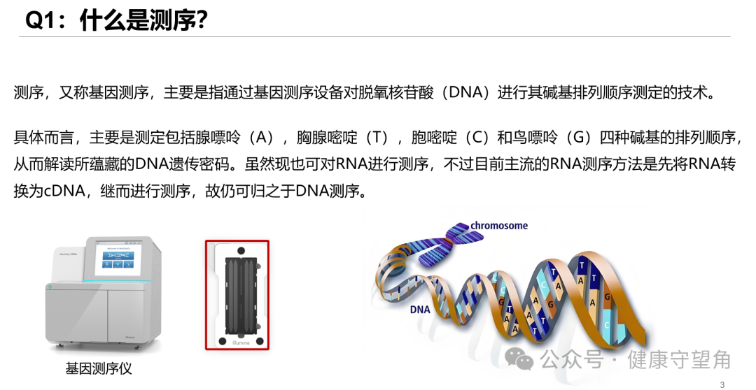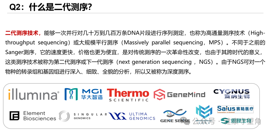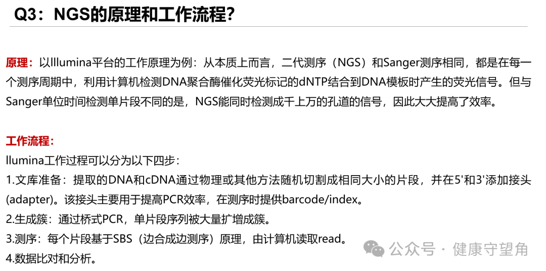 测序,又称基因测序,主要是指通过基因测序设备对脱氧核苷酸(DNA)进行其碱基排列顺序测定的技术。 具体而言,主要是测定包括腺嘌呤(A),胸腺嘧啶(T),胞嘧啶(C)和鸟嘌呤(G)四种碱基的排列顺序,从而解读所蕴藏的DNA遗传密码。虽然现也可对RNA进行测序,不过目前主流的RNA测序方法是先将RNA转换为cDNA,继而进行测序,故仍可归之于DNA测序。 Q2:什么是二代测序? 二代测序技术,能够一次并行对几十万到几百万条DNA片段进行序列测定,也称为高通量测序技术(High-throughput 原理:以lllumina平台的工作原理为例:从本质上而言,二代测序(NGS)和Sanger测序相同,都是在每一个测序周期中,利用计算机检测DNA聚合酶催化荧光标记的dNTP结合到DNA模板时产生的荧光信号。但与Sanger单位时间检测单片段不同的是,NGS能同时检测成千上万的孔道的信号,因此大大提高了效率。 工作流程: llumina工作过程可以分为以下四步: 1.文库准备:提取的DNA和cDNA通过物理或其他方法随机切割成相同大小的片段,并在5'和3'添加接头(adapter)。该接头主要用于提高PCR效率,在测序时提供barcode/index。 2.生成簇:通过桥式PCR,单片段序列被大量扩增成簇。 3.测序:每个片段基于SBS(边合成边测序)原理,由计算机读取read。 4.数据比对和分析。 单端测序(Single-read)是指首先将DNA样本进行片段化处理形成200-500bp的片段,引物序列连接到DNA片段的一端,然后末端加上接头,将片段固定在flow 双端测序(Paired-end)是指在构建待测DNA文库时在两端的接头上都加上测序引物结合位点,在第一轮测序完成后,去除第一轮测序的模板链,用对读测序模块(Paired-End 双端测序较单端测序的优势主要有以下两点: 1、Illumina测序的片段长度较短,单端测序对于不同位置重复出现的序列片段识别出相同的信息,这导至将该序列比对至参考序列中时,出现一定的误差。而双端测序中,不同读段间的距离已知,即使对于重复出现的序列,双端测序也可推断出不同序列出现的位置,大大减少了序列比对的误差,故双端测序的序列信息往往可以得到较好的组装结果。