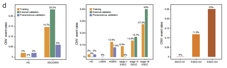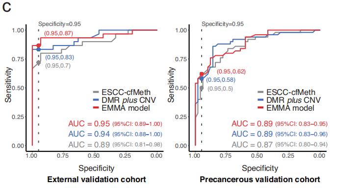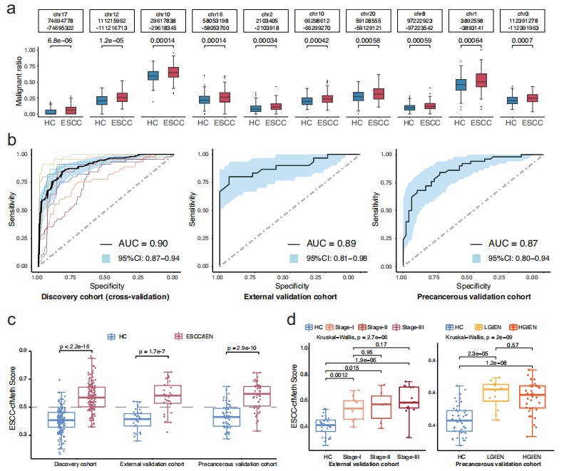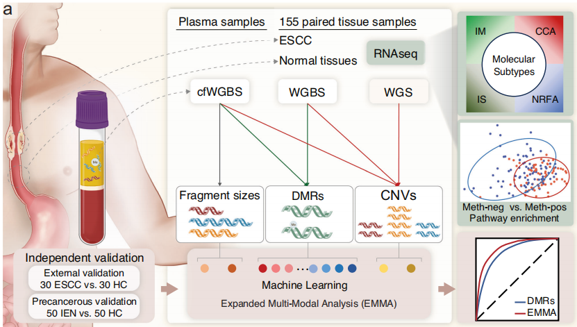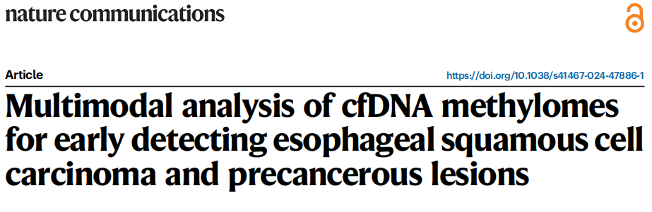 食管癌(EC)是最常见的胃肠道恶性肿瘤之一,食管鳞状细胞癌(ESCC)是EC的主要组织学亚型,约占新发EC病例的88%,主要发生在东亚和中亚。ESCC预后不佳,其特点是5年总生存率低(美国和中国分别为18.5%和36.9%),这主要归因于晚期诊断。相比之下,早期ESCC通过内镜整体切除可达到近100%的5年疾病特异性生存率,无需系统治疗。因此,早期发现对于提高ESCC患者的生存和生活质量至关重要。 诊断ESCC及其前驱病变的金标准仍然是碘染色内镜检查。然而,内窥镜筛查的广泛采用面临着挑战,包括低依从性和大规模人群进行内窥镜检查的巨额费用。液体活检方法能够检测血浆中游离细胞DNA (cfDNA)中的循环肿瘤DNA (ctDNA),为非侵入性早期癌症检测提供了一条有前途的途径。然而,很少有研究评估液体活检在ESCC诊断中的应用。 近日,杂志Nature Communications上发表了一篇题为“Multimodal analysis of cfDNA methylomes for early detecting esophageal squamous cell carcinoma and precancerous lesions”的文章,作者开发了扩展多模态分析(EMMA)方法,同时识别cfDNA样本全基因组亚硫酸盐测序(WGBS)数据中与癌症相关的差异甲基化区域(DMRs)、CNVs和片段化特征。EMMA显著提高了检出率,AUC为0.99,在验证队列中检测到87%的ESCC和62%的癌前病变,特异性>95%。证明了cfDNA甲基化组学的多模态分析在ESCC早期检测和分子特征监测中的潜力。 图片来源:Nature Communications 主要内容 cfDNA全基因组亚硫酸盐测序中的 EMMA框架概述 为了提高ESCC的早期检测,作者开发了基于“组织- cfDNA-组织”策略的EMMA框架(下图a),全面分析cfDNA WGBS数据中的癌症衍生的差异甲基化区域(DMRs)、拷贝数变异(CNVs)和片段特征。肿瘤来源的DMRs和CNVs是从155例ESCC患者的原发肿瘤和配对组织中的WGBS和WGS数据确定的。随后,在cfWGBS数据中检测了ESCC衍生的DMRs和CNVs,以及短cfDNA片段大小的比例(FSRs)来训练诊断模型。在外部ESCC队列和癌前病变队列中独立评估了每个诊断模型的性能。 cfDNA全基因组亚硫酸盐测序中的EMMA框架概述。 图片来源:Nature Communications cfDNA甲基化标记的识别与性能分析 在cfDNA中,作者通过比较150名ESCC患者和150名HC的WGBS数据,确定了650个DMRs。随后计算每个样本中每个DMR的cfDNA恶性比率,并利用随机森林算法生成了预测模型(ESCC-cfMeth评分),使用50个DMR的cfDNA恶性比率构建(图a),包括40个低DMR和10个高DMR。在外部验证队列中,AUC为0.89,在癌前验证队列中,AUC达到0.87 (图 b)。 作者注释了这50个DMRs的基因,有部分基因在ESCC发育中起关键作用。综上所述,这些发现不仅强调了这些cfDNA甲基化特征在ESCC诊断中的可靠性和可解释性,而且表明了它们在ESCC进展中的潜在功能相关性。 cfDNA甲基化标记的识别与性能分析。 图片来源:Nature Communications 用于ESCC检测的cfDNA CNVs识别 作者开发了一种基于WGBS的方法来识别组织和cfDNA样本中的共同的CNVs。与HC的CNV事件相比,ESCC患者中有153个区域的CNV事件发生率明显更高,其中111个扩增区域和42个缺失区域。从HGIEN开始,CNV事件的发生率逐渐增加,并与癌症分期和分级呈正相关(图d)。这些结果突出了cfDNA中CNV事件的高特异性(范围从98%到100%),并且它们与肿瘤进展和晚期疾病呈正相关。 用于ESCC检测的cfDNA CNVs识别。 图片来源:Nature Communications cfDNA WGBS数据中片段组学 为了进一步揭示cfDNA的多模态特征,作者对发现队列中的cfDNA片段大小进行了全面分析。ESCC患者和HC的cfDNA样本均在166 bp处出现峰值。然而,在ESCC组中观察到更高比例的短片段(90-150 bp)。通过评估cfDNA短片段与人类基因组的比例来计算FSR。ESCC患者和HC在所有bin中的平均FSR没有发现显著差异。然而,ESCC患者中发现了83个FSRs显著升高的bin。在发现队列和外部验证队列中,ESCC患者在这83个选定的bin中的平均FSRs显著更高。但在癌前验证队列的IEN患者中没有观察到这种显著差异(图d)。 分析WGBS数据中的cfDNA片段的大小分析。 图片来源:Nature Communications 联合EMMA模型对ESCC 及癌前病变的准确检测 作者建立了两个联合诊断模型:一个是DMR + CNV模型,另一个是DMR + CNV+FSR模型(EMMA模型)。与ESCC-cfMeth评分相比,DMR + CNV模型与 EMMA模型的表现都显著改善,在外部验证队列(AUC分别为0.94和0.95)和癌前验证队列(AUC均为0.89)中也表现出优异性能(图 c)。当特异性>95%时,EMMA模型在外部验证队列中敏感性为87%,在癌前验证队列中敏感性为62%(图c)。总体而言,EMMA模型将IENs的检出率提高到62%,ESCC一期为78%,二期为83%,III期为93%,同时保持了>95%的特异性。 联合EMMA模型对ESCC及癌前病变的准确检测。 图片来源:Nature Communications 总结与讨论 作者对来自非转移性ESCC或癌前病变患者和匹配健康对照的460份cfDNA样本进行了全基因组亚硫酸盐测序(WGBS),并开发了一个扩展的多模态分析(EMMA)框架,以同时识别cfDNA WGBS数据中的cfDNA甲基化、拷贝数变异(CNVs)和片段化特征。cfDNA甲基化标记是最早和最敏感的,在70%的ESCC和50%的癌前病变中可检测到,并且与分子亚型和肿瘤微环境相关。CNVs和片段化特征显示出高特异性,但只与晚期疾病有关。EMMA显著提高了检出率,AUC为0.99,在验证队列中检测到87%的ESCC和62%的癌前病变,特异性>95%。证明了cfDNA甲基组的多模态分析在ESCC早期检测和分子特征监测中的潜力。 但研究也有一些局限性。首先,尽管分析了超过1000个全基因组数据集,但验证队列相对较小。其次,这些多模态标记物的潜在功能仍然未知,特别是在癌前病