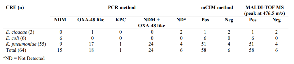 1. 使用PCR方法检测碳青霉烯酶编码基因blaKPC、blaNDM、blaVIM、blaIMP、blaOXA-23-like、blaOXA-48-like。 2. 使用改良的碳青霉烯灭活法(mCIM)检测产碳青霉烯酶肠杆菌的表型。 3. 使用MALDI-TOF MS检测(厄他培南水解法):将厄他培南药物与细菌菌株混合培养,通过质谱检测特异性分子量476.5m/z(±500 ppm)的厄他培南[M+H]+确认CPE,通过峰消失判断为产碳青霉烯酶阳性。