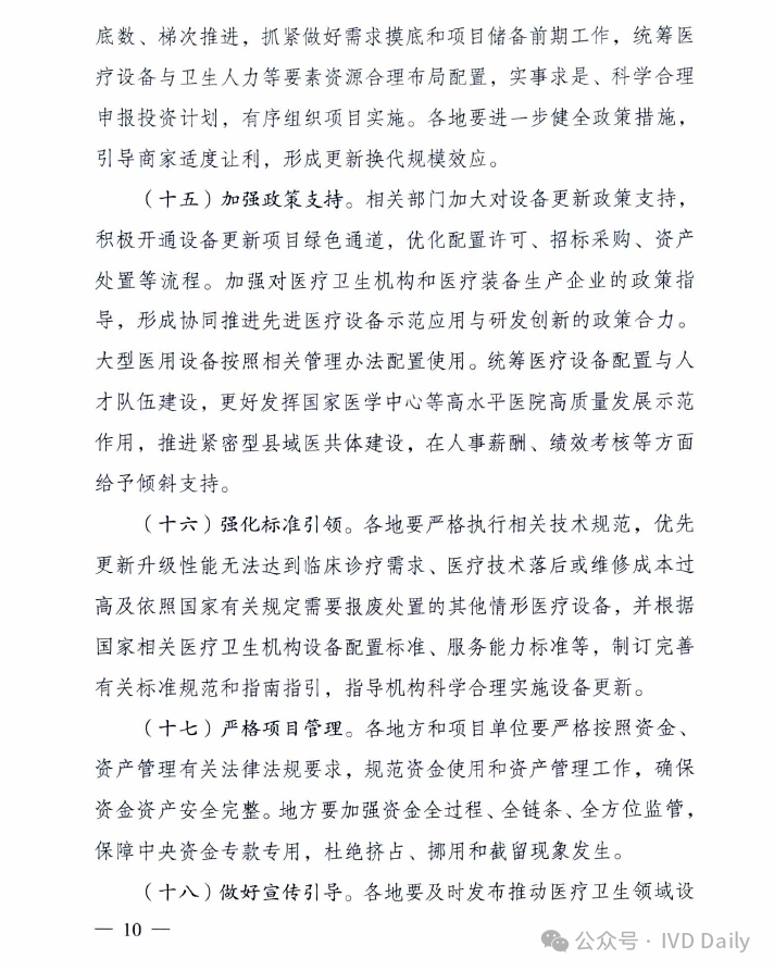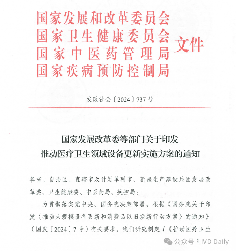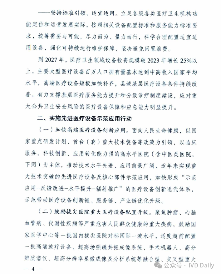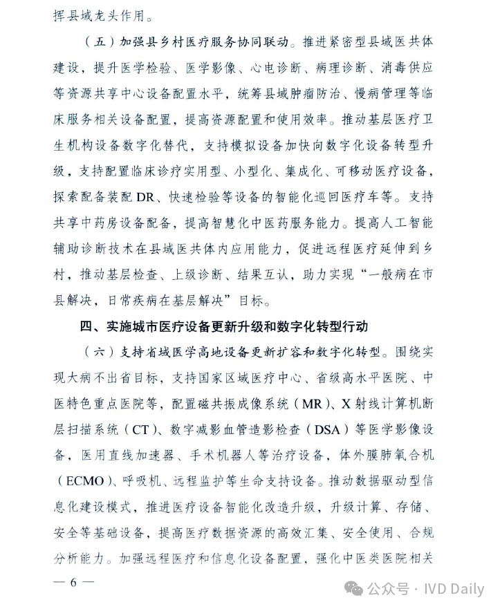 近日,国家发改委、国家卫健委、国家中医药管理局、国家疾控局四部委联合印发《关于推动医疗卫生领域设备更新实施方案的通知》。 通知明确到2027 年,医疗卫生领域设备投资规模较2023年增长25%以上,高端医疗设备短板加快补齐,县域基层医疗设备条件持续改善,有力支撑基层医疗服务能力提升和分级诊疗制度建设,应对重大公共卫生安全风险的医疗设备保障和应急能力明显提升。 鼓励拔尖医院重大医疗设备配置升级 适度超前配置,推动产学研转化! 聚焦肿瘤、心脑血管病、代谢性疾病等严重危害人民群众健康的重大疾病,鼓励国家医学中心等一批国内拔尖医院对标国际一流水平,适度超前配置一批高端放疗设备、超高场强磁共振成像系统、手术机器人、高分辨质谱仪、超高分辨率显微成像及分析系统等融合型、交叉型重大医疗和科研设备,提升医院疑难危重症诊疗、关键医学技术攻关能力,推动我国临床医学和科研转化走在世界前列。 推进乡村医疗卫生机构设备标准化 基层医疗规范标准! 以中西部为重点,参考《乡镇卫生院医用装备配置标准》等要求,填平补齐、对标达标,支持服务人口多、基本医疗服务能力强的乡镇卫生院,配置x射线计算机断层扫描系统(ci)、数字射线成像检测(DR)、彩超、全自动生化分析仪等设备,以及呼吸机、肺功能仪等满足基本医疗服务需求的通用和专用设备,加快提升常见病、多发病诊疗以及预防保健、康复护理、健康管理、医养结合、中医药健康服务能力,提高设施设备适老化水平。乡镇卫生院中医科设备配置参考《中医综合服务区(中医馆)建设指南》。加强乡村医疗卫生人员配备与培训,提升设备运行维护能力,坚决杜绝闲置浪费。 支持县级医院医疗设备提质 五大中心建设再提速! 参考《县级综合医院设备配置标准》《县级中医医院医疗服务能力基本标准和推荐标准(试行)》等要求,综合当地服务人口以及服务范围内群众卒中、胸痛、创伤、危重孕产妇救治、危重儿童和新生儿救治等医疗服务需求等因素,根据承担功能定位,支持县级医院科学合理配置除颤仪、呼吸机、血液透析、便携式彩超、转运监护仪、新生儿监护、床旁血气分析仪等设备,支持配备中医电、磁、热等特色诊疗设备,提升肿瘤、心脑血管疾病等重大疾病诊疗能力,加强急诊、重症、中医、老年医学、康复、安宁疗护等专科能力建设,支撑县级医院更好发挥县域龙头作用。 加强县乡村医疗服务协同联动 推进县域医共体建设;基层结果互认! 推进紧密型县域医共体建设,提升医学检验、医学影像、心电诊断、病理诊断、消毒供应等资源共享中心设备配置水平,统筹县域肿瘤防治、慢病管理等临床服务相关设备配置,提高资源配置和使用效率。推动基层医疗卫生机构设备数字化替代,支持模拟设备加快向数字化设备转型升级,支持配置临床诊疗实用型、小型化、集成化、可移动医疗设备,探索配备装配DR、快速检验等设备的智能化巡回医疗车等。支持共享中药房设备配备,提高智慧化中医药服务能力。提高人工智能辅助诊断技术在县域医共体内应用能力,促进远程医疗延伸到乡村,推动基层检查、上级诊断、结果互认,助力实现“一般病在市县解决,日常疾病在基层解决”目标。 实施城市医疗设备更新升级和数字化转型行动 支持省域医学高地设备更新扩容和数字化转型 围绕实现大病不出省目标,支持国家区域医疗中心、省级高水平医院、中医特色重点医院等,配置磁共振成像系统(MR). x 射线计算机断层扫描系统(CT)、数字减影血管造影检查(DSA )等医学影像设备,医用直线加速器、手术机器人等治疗设备,体外膜肺氧合机(ECMO)、呼吸机、远程监护等生命支持设备。推动数据驱动型信息化建设模式,推进医疗设备智能化改造升级,升级计算、存储、安全等基础设备,提高医疗数据资源的高效汇集、安全使用、合规分析能力。加强远程医疗和信息化设备配置,强化中医类医院相关信息化设备更新换代,支撑提升疑难危重症及罕见病诊治能力,让群众在省域内享有更加公平可及、系统连续、高质量的健康服务。 加快城市医院老旧设备淘汰更新 提质扩围,设备更新换代! 以人口净流入量大、公共服务缺口大的城市为重点,加快淘汰落后低效、故障率和维修成本过高的医疗设备,更新换代高性能磁共振、彩超、胃肠镜等需求大的诊疗设备,缩短患者排队等候时间。推进紧密型城市医疗集团等医联体建设,更新换代精准化、便捷化、智能化、远程化医疗设备和信息化设施,提高医疗资源配置使用效率。鼓励城市二级医院转型,更新换代康复护理、监护、中医诊疗等智能医疗设备。推广应用远程诊断、远程治疗、远程教学系统,发展应用脉诊、康复等智能中医诊疗设备,提高医疗服务效率和质量。支持社区卫生服务中心设备更新升级。协同病房改造提升行动,配备补齐监护仪、即时即地检验(POCT )等床旁设备及康复训练设备,适度加装电梯、无障碍、移乘设备等,改善病房住院条件。