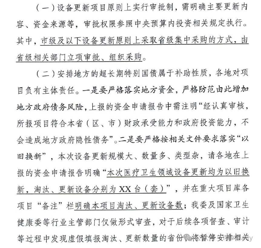 提升突发事件卫生应急响应和紧急医学救援能力! 统筹考虑突发事件公共安全风险和区域应急资源规划布局,支持国家紧急医学救援队、国家突发急性传染病防控队伍等国家卫生应急队伍以及国家级、省级中毒、核辐射救治基地,更新抢救、监护、检测、治疗、手术等必要设备,强化应急通讯指挥、专业处置、后勤保障等设备保障,提升突发事件紧急医学救援综合能力。发挥中医药在新发突发传染病等重大公共卫生事件中的独特作用,加强国家中医疫病防治基地等设备配备。推进“平急两用”应急保障医院建设,支持有关城市合理配置和更新医疗应急设施设备,增强城市公共安全韧性。提升院前急救和创伤救治设备水平,地方应按标准配置更新地市、县域院前急救车辆和车载设备,提升城市和县域急救能力,加强各级创伤中心、急救中心创伤救治设备配置更新,合理配备自动体外除颤器(AED)、车载CT 等,加快提升创伤救治水平,确保创伤患者得到及时、有效救治。 提升传染病病原体检测能力 提高传染病患者病原学诊断率! 以提升新发突发传染病和不明原因疾病“早发现”能力为重点,支持医疗机构、疾病预防控制机构等按照相应标准规范,更新配备生物安全柜、高压蒸汽灭菌器、核酸提取仪、荧光定量PCR 等设备,迭代更新实时监测、冷链等设备,加强实验室仪器设备升级和生物安全防护能力建设,提升传染病病原体等检验检测能力。推动医疗机构病原微生物实验室监测能力建设,提高传染病患者病原学诊断率。综合考虑区域重大战略、交通条件、公共安全风险因素等,统筹加大对边境口岸地区等传染病检测设备配置支持力度。 提升血液供应保障能力 立足血液供应保障总体布局和保障血液安全实际需要,支持血站设备配置提升,更新配备核酸检测设备、酶免分析仪、血型分析仪、生化分析仪等血液检测及血液采集运输、制备、储存等设备,提升血液管理信息化水平,提高血液供应保障能力和安全水平。 提升其他专业公共卫生服务能力 支持妇幼保健机构、危重孕产妇和新生儿救治中心、产前筛查诊断机构、新生儿听力障碍筛查诊治机构,参考相关标准加强重点设备配备与更新,着力强化妇产科、儿科、乳腺外科、妇幼保健等专科能力建设,全面提升妇幼健康服务能力。支持职业病防治院所等相关机构,加强职业病防治、危害监测及事故事件应急处置所需设备的配置。 医疗卫生领域设备更新所需资金,由超长期国债、地方财政资金、地方政府专项债券等资金筹措安排。对于地方项目,国债资金属于补助性质。同一项目原则上不得重复申请不同中央专项资金,避免重复投入。各地要积极调整自身财政支出和投资结构,统筹用好地方政府专项债券等资金渠道,切实履行公立医疗卫生机构投入和保障主体责任,确保有关设备更新配置资金足额到位。 对于国债资金安排,标准如下: 对地方的医疗卫生领域设备更新项目,原则上按照东、中、西、东北部地区分别不超过项目总投资的 40%. 60%, 80%、 8 0%的比例进行支持,享受特殊区域发展政策地区按照具体政策要求执行。中央本级项目按照有关标准执行。西藏自治区、南疆四地州、四省涉藏州县项目最高可在支持限额内全额支持。 遴选原则 申报要求 通知原文如下: |
