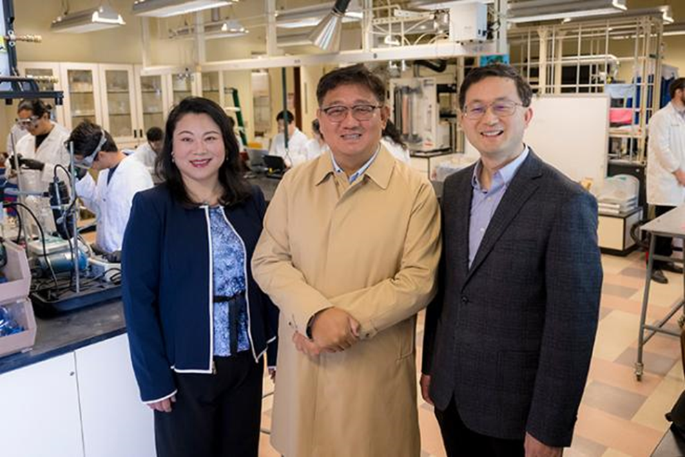 Doreen和Jeff Li与新命名的Aiiso 雨峰李家族化学与纳米工程系主任Liangfang Zhang一起上化学工程实验课。