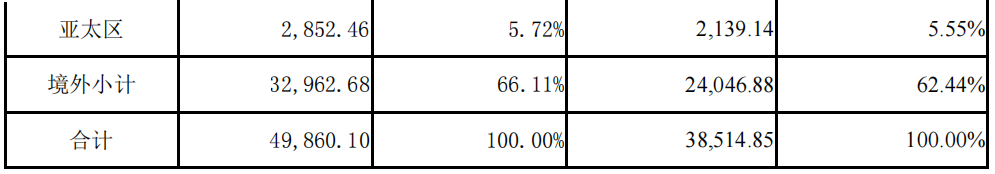 2023年海外收入1711106118.25元,海外占总营收42.16%。其中,美国收入1418039795.67元,占总营收34.94%,占海外收入的82.87%。