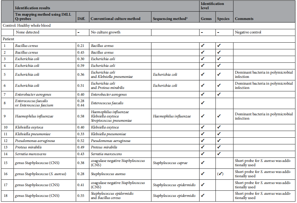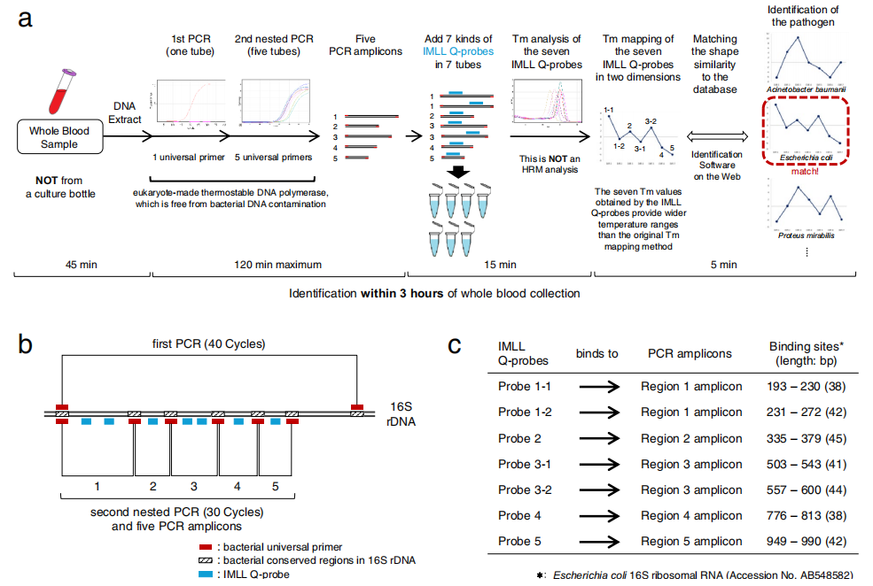 脓毒症的明确诊断需要正确识别致病微生物。尽早识别病原微生物对于选择合适的抗菌药物治疗和在感染患者中获得有利的结果至关重要。之前此文章作者曾报道了一种新的快速,简单和经济有效的方法,称为熔融温度(Tm)映射法,用于在全血采集后3小时内识别广泛的致病菌。然而,Tm鉴定需要在同一试验中PCR管间的测量误差不超过0.1°C,因此只能使用最佳的分析仪器,如QIAGEN或Roche Applied Science的仪器,这是此方法推广的主要障碍。 近日,杂志Scientific reports上发表了一篇题为“Melting temperature mapping method using imperfect-match linear long probes”的文章。为了解决上述问题,作者开发了一种不完全匹配线性长探针的改进Tm映射方法。利用长探针,Tm映射方法可以产生更大的Tm值变化范围,从而几乎所有市售的分析仪器都可以用于Tm映射方法。 图片来源:Scientific reports 主要内容 不完全匹配线性长探针(IMLL Q探针) Tm映射方法的工作流程 使用IMLL Q探针识别未知病原体的Tm映射方法的工作流程。包括四个主要步骤。首先,从临床样本中提取细菌DNA作为PCR的模板。第二步利用真核细胞制造的耐热DNA聚合酶,使用5个细菌通用引物组进行巢式PCR (图b),并获得五个(或更少)PCR扩增子。第三步,将1区和3区PCR扩增子分成两部分,然后将共7个PCR扩增子与7种IMLL q探针混合(图a-c)。通过分析7个IMLL q探针获得7个Tm值。第四步在两个维度上制图七个Tm值,称为Tm映射形状,并与数据库中的形状进行比较,可以快速鉴定分离的细菌。该方法在全血采集后3小时内鉴定临床样本中的优势细菌(通常是致病菌),且可以与几乎所有市售的实时PCR仪器一起使用。 IMLL Q探针Tm映射方法的工作流程。 图片来源:Scientific reports 设计IMLL Q探针的策略 作者设计IMLL Q探针时,有四点需要考虑。首先,使不同菌种的Tm值有更大的变化范围。其次,设计足够长的探针(大约40 mer)来结合几乎所有种类的细菌,即使有多处错配。第三,设计不具有二级结构而是具有线性结构的长探针,以防止自猝灭。最后,设计探针以获得各种细菌种类的Tm值,并可用来鉴定细菌种类。结果显示,使用IMLL Q探针,71种细菌的Tm值范围超过20°C。 利用IMLL Q探针构建Tm映射数据库 使用IMLL Q探针测量三次Tm值的平均值,作者构建了68个物种Tm图谱形状的初步数据库(下图)。单个Tm映射形状显示出独特的形状,反映了每种细菌的IMLL Q探针杂交中错配的数量和位置。鉴定软件程序将其搜索范围缩小到数据库中与IMLL Q-probe结合模式相同的细菌。 Tm映射数据库数种细菌Tm形状示意图。 图片来源:Scientific reports 利用IMLL Q探针 评估Tm映射方法的精度 作者使用Rotor-Gene Q仪器鉴定细菌DNA。在68种细菌中,62种Tm映射结果与Sanger测序结果相匹配,但6种Tm定位结果无法缩小到单一细菌物种,比如不能区分粪肠球菌和屎肠球菌,也不能区分金黄色葡萄球菌、溶血性葡萄球菌、人型葡萄球菌和路邓葡萄球菌。这是因为当IMLL Q-probes属于同一属时,它们的目标碱基序列的多样性是有限的。对于葡萄球菌属,作者做了一个短探针专门鉴定金黄色葡萄球菌,成功地将金黄色葡萄球菌与CNS区分开来,耗时10分钟。 在几乎所有市售的实时PCR仪器中,使用IMLL Q探针的Tm映射方法能够在物种水平上识别68种细菌中的至少60种;其余8个Tm的定位结果在属水平上是匹配的,但无法缩小到单个细菌物种。 临床样本的验证 利用18例脓毒症患者的全血样本,作者比较了使用IMLL Q探针和LightCycler 480仪器的Tm映射方法与传统培养方法的准确性。作为阴性对照,Tm映射法和常规培养法均未检出健康全血细菌。在18个Tm映射结果中,有13个与培养或测序结果相匹配,但对于粪肠球菌或葡萄球菌属,Tm结果无法缩小到单一细菌种。此外,在9号患者中,培养结果显示流感嗜血杆菌、产氧克雷伯菌和肺炎链球菌,而Tm映射和测序结果仅显示流感嗜血杆菌,这是因为Tm映射方法能够仅识别临床样品中的优势细菌。 临床样本的验证结果。图片来源:Scientific reports 总结与讨论 作者开发了一种不完全匹配线性长探针的改进Tm映射方法。利用长探针,Tm映射方法可以产生更大的Tm值变化范围,从而几乎所有市售的分析仪器都可以用于Tm映射方法。使用IMLL Q探针的Tm映射方法能够在全血采集后3小时内鉴定临床样品中的优势细菌。值得注意的是,与目前的Tm定位方法相比,几乎所有市售的实时PCR仪器都可以使用使用IMLL q探针的改进Tm鉴定方法。有些细菌种类不能缩小到单一种类,但它们至少可以缩小到属的水平。在这种情况下,可以使用定制的短探针来识别特定的细菌,这只需要10分钟即可完成。使用IMLL Q探针的Tm映射方法对于检测需要及时治疗的传染病(如败血症)特别有用,预计将有助于治疗严重感染患者。 |