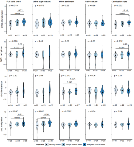 detection in patient-friendly samples”的文章。在这项研究中,作者探讨了分子检测在家庭收集的尿液和宫颈阴道样本以及临床采集的宫颈刮片中检测卵巢癌的潜力,包括甲基化标志物、体细胞拷贝数变异(SCNA)和DNA片段化模式。结果显示,在卵巢癌患者家中收集的尿液样本中,三个甲基化标志物的甲基化显著升高(C2CD4D ;CDO1;MAL),其中C2CD4D和CDO1在宫颈刮片样本也具有显著区别。在23例卵巢癌患者的尿液样本中,有4例发现了拷贝数变化。然而良性病例尿液中类似的高甲基化水平对创建临床有用的测试提出了挑战。