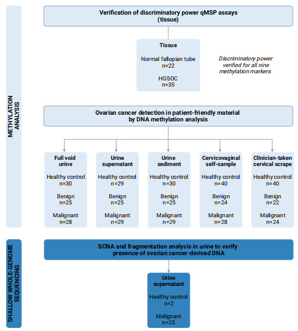 卵巢癌是全球最致命的妇科癌症,由于早期无特异性症状,患者多在晚期确诊。早期疾病的5年总生存率为92%,而晚期疾病的生存率仅为29%。DNA甲基化介导的肿瘤抑制基因沉默发生在癌症发展的早期,因此有望在早期发现癌症。在临床采集的宫颈刮片或血液中测量体细胞突变、非整倍体或DNA甲基化,已经显示了基于分子的卵巢癌诊断测试的巨大潜力。然而,这些分子变化尚未在患者友好的样本类型,比如家庭自收集的患者尿液和子宫颈阴道自收集样本中进行研究。