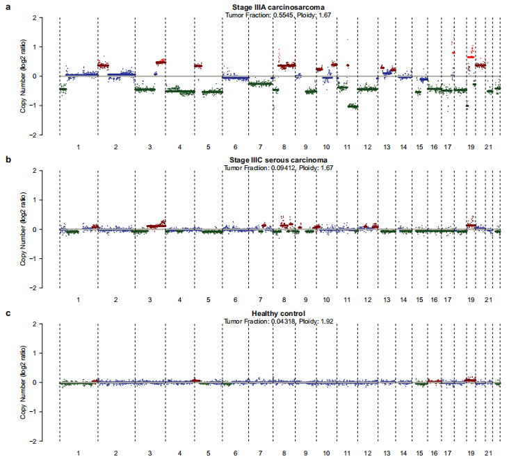 通过对25例卵巢癌患者(n = 23)和健康对照(n = 2)的尿液上清样本进行低深度全基因组测序,验证了尿液中存在卵巢癌来源的DNA。在23个测序的卵巢癌患者尿液上清样本中,有4个发现了异常的全基因组拷贝数谱(下图)。这些病例的尿液与原发肿瘤组织的拷贝数谱一致。