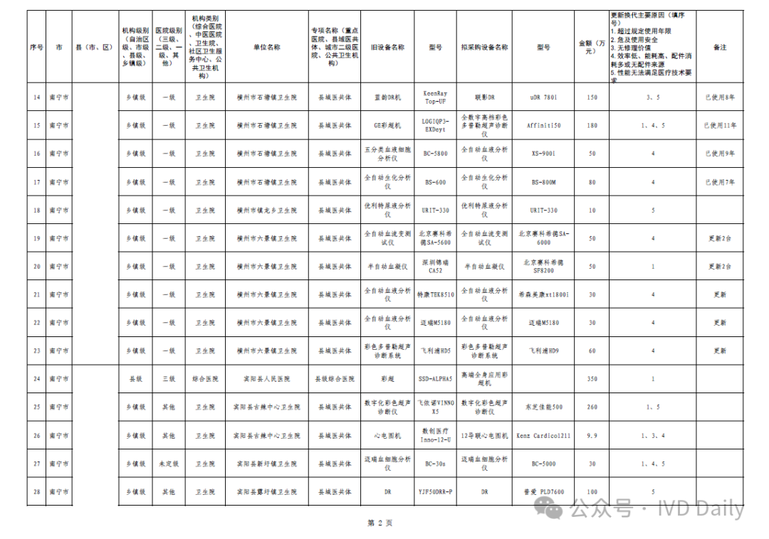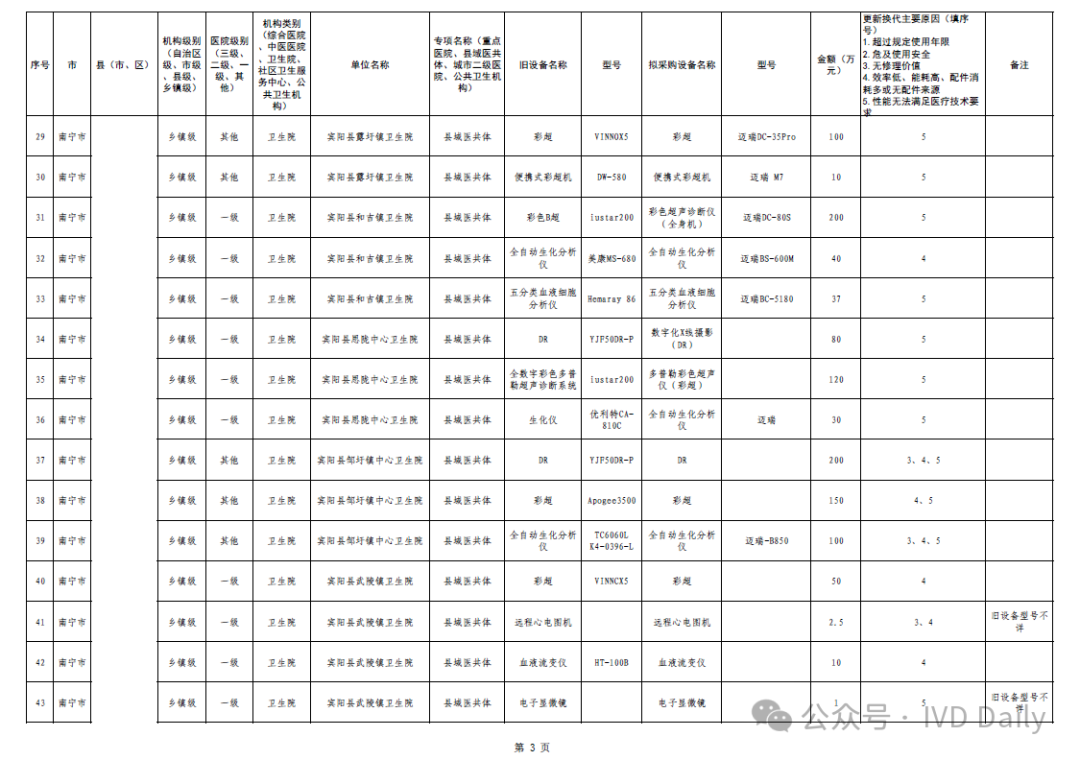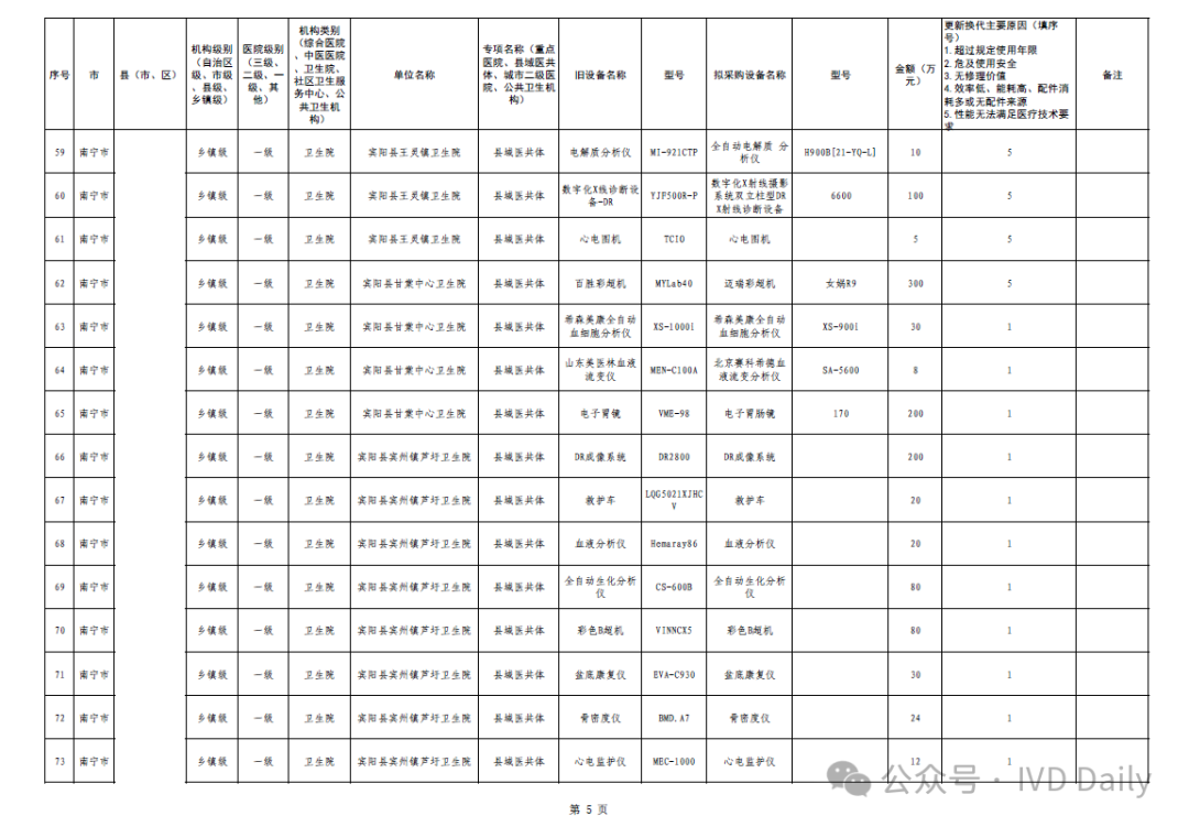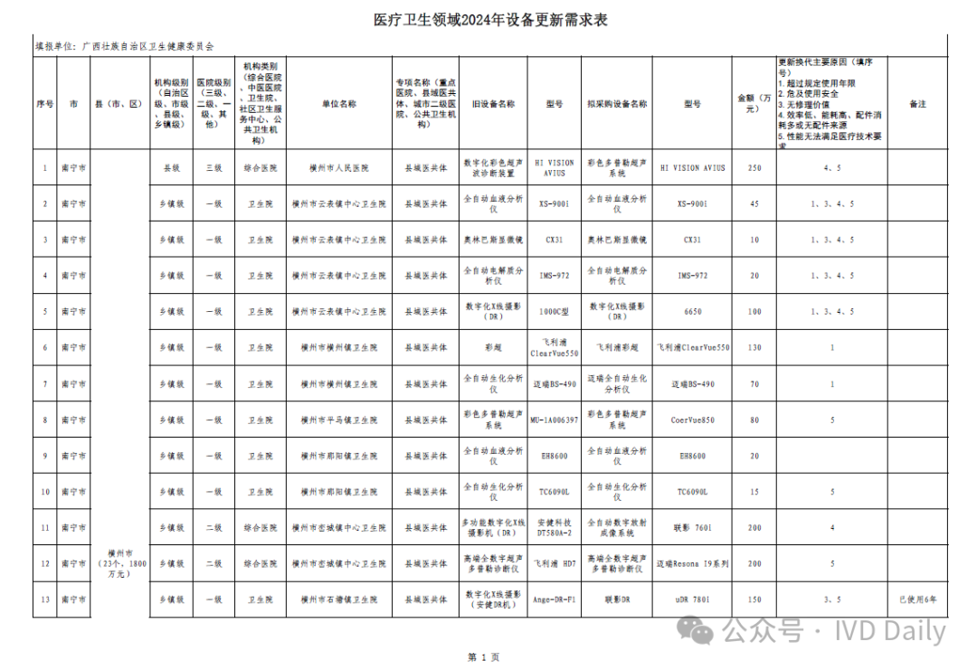 刚刚,广西卫生健康委发布2024年县域医共体设备更新项目可行性研究报告。 本次设备更新规模和计划如下: 根据广西全区目前医疗工作需要,本项目为以旧换新项目,报废设备1292台。 项目总投资7.05亿。其中购置CT、DR、彩超、全自动生化分析仪、血液分析仪、电解质分析仪、尿液分析仪其他等设备7.05亿。 项目资金来源:申请超长期特别国债5亿元;市县配套资金及单位自筹2.05亿元。 项目实施进度期为2024年6月-2024年12月,共计6个月: 2024年7月-完成项目可研报告编制和批复工作; 2024年7月-9月,完成项目招投标工作; 2024年9月-12月,完成设备安装交付验收工作。 规划政策符合性 《中华人民共和国国民经济和社会发展第十四个五年规划和2035年远景目标纲要》 本项目的建设地处于广西壮族自治区,旨在促进国家公共卫生发展,紧跟国家2035年远景目标规划, 为广西人民提供全方位全生命期健康服务。 《高举中国特色社会主义伟大旗恢为全面建设社会主义现代化国家而团结奋斗》 日前广西省医疗卫生资源总量不足、布局不均、整合不够等问题依然存在。本项目建设能够促进广西省优质医疗资源扩容和区域均衡布局。为广西人民健康安全保驾护航。 《"十四五" 优质高效医疗卫生服务体系建设实施方案》 本项目建设能够努力让广大人民群众就近亨有公平可及、系统连续的高质量医疗卫生服务, 为广西人民健康安全保驾护航。 《公立医院高质量发展促进行动 (2021-2025年)》 综上,本项目是按照落实(中华人民共和国国民经济和社会发展第十四个五年规划和 2035 年远景目标纲要) 《高举中国特色社会主义伟大旗帜为全面建设社会主义现代化国家而团结奋斗》 《"十四五" 优质高效医疗卫生服务体系建设实施方案》《公立医院高质量发展促进行动 (2021-2025年)》纲领性文件的切实行动,是落实完善公共卫生服务具体表现,符合经济社会发展规划。 附件:(节选)广西医疗卫生领域2024年设备更新需求表: 来源:广西卫生健康委、IVD Daily、IVD联盟。 |