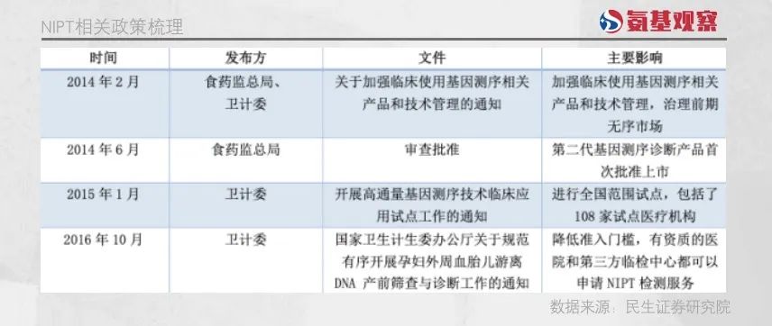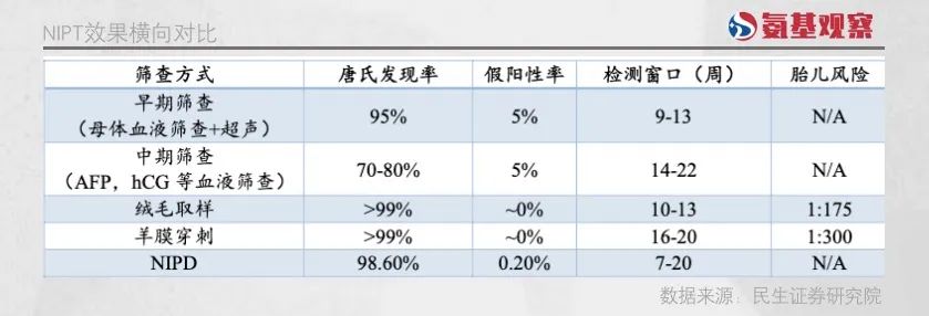 谈及NGS(二代基因测序为技术)技术的发展,NIPT(作为无创产前诊断)是绝对绕不开的话题。 NIPT作为一种非侵入性的产前检测技术,通过采集孕妇外周血,并从中提取胎儿游离 DNA,以此判断腹中胎儿的基因型和发育状况。 在唐筛等疾病领域,NIPT发挥了极大的作用,也成了NGS领域的第一个爆款。华大基因、贝瑞基因等企业都是借助NIPT完成了重要的跃迁。 虽然以NGS为技术平台的NIPT市场逐步走向没落,基因测序技术服务的龙头公司已经开始把眼光放到了NIPT以外的领域,但从生殖和遗传健康的延伸,到肿瘤领域的扩展,至今仍没有出现NIPT这样的爆款。 从这个角度来说,NIPT为什么成功,仍是一个值得回顾的话题。或者说,下一个爆款,必然脱离不了NIPT爆火的要素。 / 01 / 无法脱离的社会价值 不管是药物还是诊断工具,能否顺利发展的前提要素,无疑是社会价值。 所谓社会价值,医院和医生的压力就小了,社会医疗保健的总开销也就下来了。更健康的人们,能更好地工作和生活,社会的整体经济活力也会提升。 虽然任何诊断工具都有极为明确的社会价值,但价值也分大小。只有社会价值更大的产品,才能够得到政策的根本性支持。典型如,针对慢性病的药物,更容易被纳入医保,而一些罕见病的药物,覆盖起来难度就会增加。 极为显著的社会价值,正是NIPT能够持续快速壮大发展的核心。 实际应用中,NIPT主要筛查包括21三体(Down,唐氏综合征)、18三体(Edward,爱德华氏综合征)和13三体(Patau,帕陶氏综合征)等常染色体整倍体缺陷。 其中,最核心的就是“唐筛”。唐氏综合征是发病率极高的一种疾病,并且随着产妇年龄的增加呈现倍数增长。 在20到24岁之间,患病率为1/1250,到35岁为1/400,到40岁为 1/106,到45岁为1/25, 49 岁后上升至 1/11。因此,对于高龄产妇而言进行产前诊断的意义显著。 相比于唐氏综合征,德华氏综合征、帕陶氏综合征患病率相对较低,但总体都呈现生产年龄增加、患病率增长的趋势。 而自从二胎政策放开后,国内高龄产妇的比例从24.5%上升至31%左右,平均年龄也从27岁增长到29岁。 即使不考虑二胎政策的影响,随着经济发展和城镇化进一步推进,产妇高龄化也符合国际上的一致趋势,我国未来面对的高龄产妇问题或许会继续加剧。 这种情况下,一种行之有效的唐筛手段,对于社会价值的意义是非常大的。也正因此,NIPT能够在最开始的莽荒时期,虽被监管紧急叫停,但随后又放开并鼓励支持,逐步实现了快速的推广。 2016年10月27日,卫计委正式废止产前筛查与诊断专业试点机构的有关规定,同时对开展产前筛查和诊断的机构、人员及设备试剂作出了新的要求。“十三五”卫生与健康规划亦提出进一步加强孕期唐氏综合症产前筛查和产前诊断。这一系列政策,为NIPT的进一步发展扫清了障碍。 而也正是因为社会价值,不同省市均出台了相应的推广NIPT的政策。例如,在2024年6月5日,广州市卫健委发布下发通知,6月6日起广州市将正式启动NIPT 2024年惠民试点项目: 广州市户籍(含配偶为广州市户籍)或持有效《广东省居住证》并常住广州的准妈妈,支付300元即可享受1次孕妇外周血胎儿游离DNA产前筛查。 当然,由于经济水平、医保基金收支水平不同,各地对于NIPT的报销政策各有不同。核心在于,医保的首要工作是保基本、量力而行。 今年4月份,医保局便表示,当前基本医疗保险制度主要还是立足于“保基本”的功能定位,保障参保人员的基本医疗需求。从现阶段医疗保险基金筹资水平和抗风险能力来看,暂时无法将肿瘤筛查这一类非治疗性的项目纳入医保支付范围。 / 02 / 产品价值之问 社会价值可以称之为赛道逻辑,NIPT的发展壮大还离不开产品逻辑。后者最为核心的要素,便是技术的可行性。 NIPT主要对母体血液循环中的无细胞DNA进行浓缩后分离和测序。其DNA扩增来源为全部血液游离DNA,其中胎儿DNA由于怀孕期间有所增加,一般不低于总量的2.7%。 借助NGS技术,NIPT可以对1%级别含量的DNA组分数量进行分析,通过去除母体DNA本底后进行比例比对,与正常组成的差异部分即为大片段染色体异常,再对检验结果进行统计学调整,给出是否进行进一步侵入式检查的判断。 除了逻辑上的可行性,产品性能也要足够优秀。 根据华大基因的招股说明书,从2009年到2015年中,华大基因已经与全球52个国家近四千家医院进行合作开展NIPT检测服务,检测的样本数已经超过了30万例,检出率和特异性均大于99.99%。 加上我国目前 NIPT质控要求较为严格,唐氏综合征检出率一般不低于99%,爱德华氏综 合征不低于97%,帕陶氏综合征不低于90%。整体复合假阳性率不高于0.5%,复合阳性预测值不低于50%。 简单来说,检出率高,保证不会误诊;而假阳性率相对较低,则保证不会过度浪费社会资源,两者共同让NIPT的产品逻辑无懈可击。 综合来看,NIPT的爆发,在于其背后的强大技术支持,高精度的DNA测序技术和先进的生物信息分析手段(技术可行性),以及经过大规模临床验证的卓越性能表现(高检出率、低假阳性率等)。 这些因素相互作用,构建了一个既符合市场需求又具有高度科学性和实用性的产品逻辑框架,使得NIPT成为产前遗传病筛查领域的一项革命性技术,并迅速发展壮大。 / 03 / 临床价值的三大要素 社会价值、产品价值之外,支撑NIPT爆发的另一关键因素,还在于临床价值。 如果单纯从检出率来看,NIPT并不是最高的,绒毛取样、羊膜穿刺