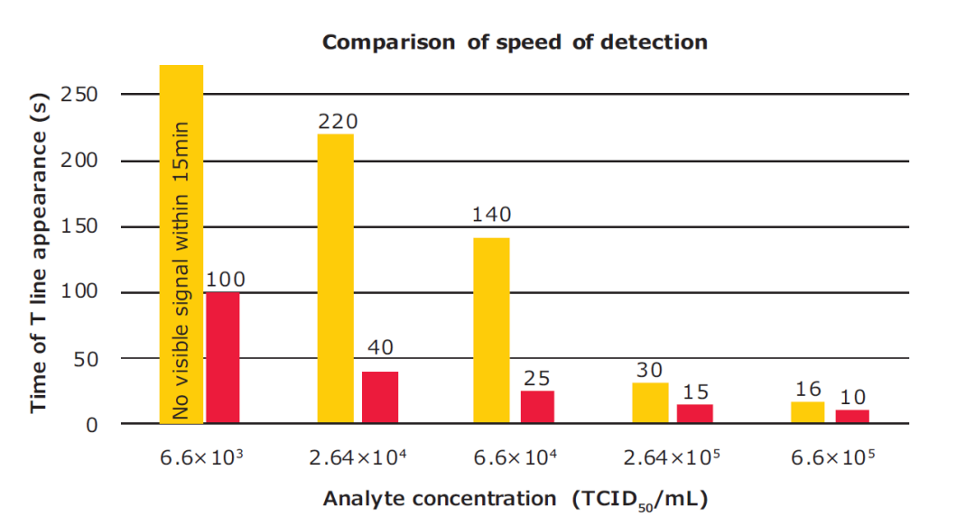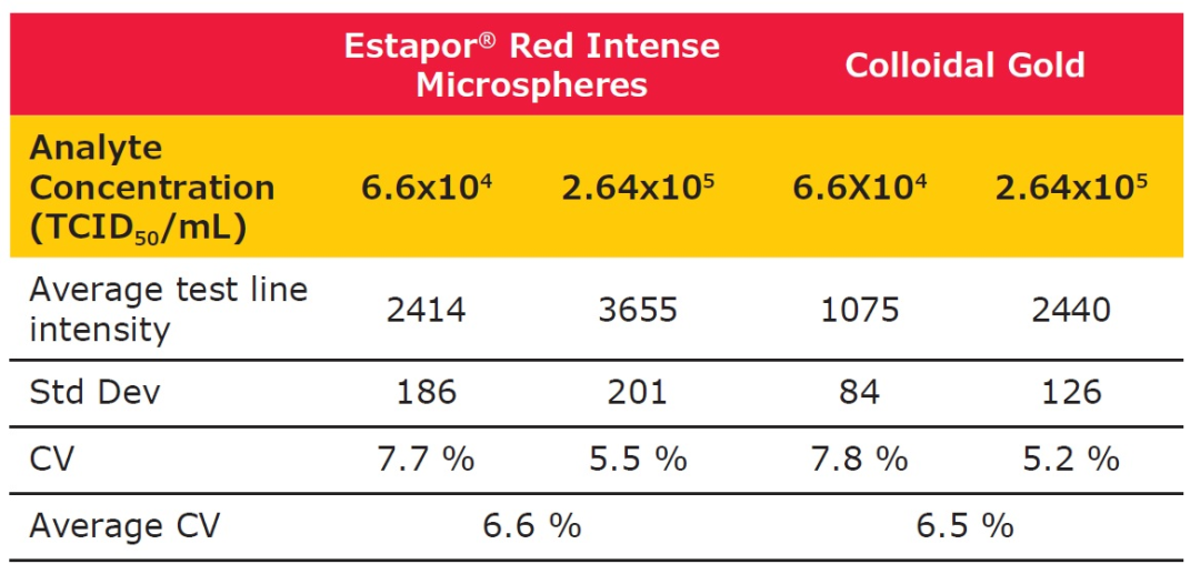 侧向层析检测技术以其快速、简便和成本效益高而著称,已成为医学诊断、环境监测和食品安全等领域不可或缺的工具。然而,它在追求更高灵敏度和更可靠结果的道路上仍面临挑战。默克公司新推出的深红色纳米微球产品,以其超越传统胶体金的性能,实现了更强烈的测试线信号、更快的可视化速度,以及可信赖的结果精度。 为了更生动地展示这些优势,我们的检测开发服务团队,使用默克Estapor® Red Intense微球配合Hi-Flow™ Plus膜进行了相关研究测试。上一篇文章中,采用Hbs Ag抗原检测模型显示,在低偶联物浓度下,Estapor® K1-040 深红色微球较竞争对手具有更强的灵敏度。此外,我们还特别对比了Estapor® K1-030 Red Intense微球与胶体金颗粒在FluA侧向层析模型中的性能表现。 更高的检测灵敏度 x 4倍 图1:FluA阳性样本的浓度梯度对比实验 我们采用了不同浓度的FluA阳性样本,通过层析检测仪对试纸条的检测线浓度进行定量分析。结果表明,在弱阳性样本的检测中,Estapor® Red Intense微球(红色条带表示)相较于传统的胶体金(黄色条带表示),展现出了更强的检测线信号。 这一结果不仅凸显了Estapor® Red Intense微球在低浓度样本检测中的高灵敏度,也验证了其在定量检测中的卓越性能。 更快的检测速度 x 5倍 图2:FluA模型中测试线的检测速度对比 在FluA阳性样本实验中中,我们通过肉眼观察记录了两种微球的测试线出现时间,以评估它们在实际应用中的响应速度。实验数据显示,Estapor® Red Intense微球的测试线以更快的速度显现,尤其在低浓度分析物检测中,其速度优势尤为明显,比传统胶体金快了五倍以上。 这一显著的速度提升不仅缩短了等待时间,也提高了检测流程的效率,使得Estapor® Red Intense微球在快速诊断领域中展现出其独特的技术优势。 一致的检测准确性 图3:Estapor®Red Intense微球与胶体金在FluA检测中定性检测对比, 浓度参见下表 表1:Estapor®Red Intense微球与胶体金在FluA检测可重复性对比 层析检测中,具有低检测限是关键要素,但获得可靠和可重复的结果同样至关重要。因此,我们对中度和强阳性样本,通过十次重复测试来评估我们的FluA 试纸条的精度。结果再次通过定性(图4)和定量(表2)进行了分析。 正如所示,Estapor® Red Intense微球和胶体金在精度/可重复性方面是可比的,平均变异系数分别为6.6%和6.5%,且在视觉感知上没有明显差异。 实验结果令人瞩目: 在FluA层析检测中,Estapor® K1-030 Red Intense微球相较于传统胶体金颗粒,在检测低浓度分析物时展现出显著的优越性。它不仅提供了更强的检测线强度,还实现了更高的灵敏度。更为重要的是,Estapor® Red Intense微球所提供的结果不仅精准,而且具有高度的可重复性,为科研和临床应用提供了坚实的信赖基础。由于篇幅所限,我们仅能摘选实验的精华部分与您分享。若您渴望深入了解每一步实验的巧妙设计与详细数据,敬请点击文末的'阅读原文',一探究竟。 订购信息 新品试用限时福利 如果您对深红色纳米微球新品感兴趣,即日起至6月30日,可扫描下方二维码提交需求,即有机会获得新品微球0.5g试用装福利。 *该活动仅针对企业客户。 *样品数量有限,根据实际参与及发放情况而定。 *收到申请后,我们会尽快审核并安排销售同事与您联系。 *本活动最终解释权归默克所有。 |