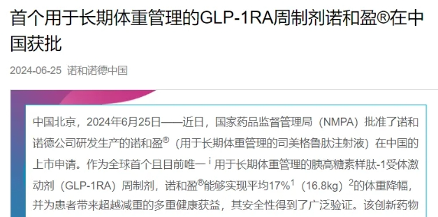 6月25日,诺和诺德宣布司美格鲁肽注射液的新适应症获国家药监局批准上市(商品名:诺和盈),作为低卡路里饮食和增加体力活动的辅助治疗用于初始体重指数(BMI)≥30kg/m2(肥胖),或≥27kg/m2且<30kg/m2(超重)并且伴有至少一种与超重相关合并症的成人患者。 司美格鲁肽注射液是一款长效GLP-1(胰高血糖素样肽-1)受体激动剂,只需每周一次皮下给药,GLP-1受体是重要的药物靶点,具有多种生理功能,包括血糖依赖性促进胰岛素分泌、保护胰岛β细胞、延迟胃排空降低食欲等。因此,司美格鲁肽具有多重作用,包括降糖、减重效果以及明确的心血管获益等。 减重领域是目前除糖尿病另外之外,司美格鲁肽开发的重点适应症,2021年6月,司美格鲁肽注射液减重适应症获得美国FDA批准上市,商品名为Wegovy,用于治疗肥胖(BMI≥30kg/m2)或超重(BMI≥27kg/m2)并伴有至少一种体重相关合并症的成人患者,成为2014年以来首款获批的减肥新药。也由此,Wegovy一经获批就获得了减肥人士的热捧和钟爱,特斯拉CEO马斯克就曾在社交媒体上晒出自己曾在短短一个月的时间内成功减去20磅(约9kg),而他自曝成功减肥的秘诀之一就是使用了Wegovy。 今年5月,在意大利举行的欧洲肥胖大会上,诺和诺德公布的两项研究结果显示,在持续接受司美格鲁肽减重药物Wegovy治疗4年后,患有心脏病但没有糖尿病的超重和肥胖患者,依然可以维持有意义的体重,且无论减重多少,心血管健康均获得了改善。该消息再次引发了业内对于司美格鲁肽的强烈关注。 在全球的热捧下,司美格鲁肽无疑已成为一款现象级的产品,其销售业绩让其他药企望尘莫及,以2023年为例,司美格鲁肽系列产品产品合计在2023年一年的时间里为诺和诺德贡献了1458.11亿丹麦克朗。同时,在去年的全球畅销药TOP10名单中,司美格鲁肽的销售业绩仅次于大卖250.11亿美元的“新晋药王”K药,位列第二。业内大胆预估,以目前的增长态势,司美格鲁肽极有可能在2024年超越K药,夺取“药王”之位。今年第一季度,司美格鲁肽系列业绩延续了继续上扬态势,为诺和诺德贡献了422亿丹麦克朗的销售战绩。 在中国市场,司美格鲁肽注射液2021年4月首次获批上市,商品名为诺和泰,适应症为用于改善2型糖尿病(T2DM)患者的血糖控制,今年1月,司美格鲁肽口服剂型获批,同样用于治疗2型糖尿病,成为国内首个获批上市的口服GLP-1(胰高血糖素样肽-1)受体激动剂。在减肥适应症方面,2022年8月,诺和诺德司美格鲁肽注射液完成了国内登记的减肥适应症III期临床(登记号:CTR20202040)。 据了解,该研究是一项随机、双盲、国际多中心的III期临床,旨在评估与安慰剂组相比,每周1次皮下注射的司美格鲁肽(2.4mg)在超重/肥胖同时患有或未患有2型糖尿病患者中的有效性和安全性。国内共入组300例患者,国际为375例。试验由中国人民解放军总医院主办,包括有南京医科大学第二附属医院、吉林大学第一医院、复旦大学附属华山医院、天津医科大学总医院等其他28家医院参与了临床试验,试验的主要终点为第44周时体重较基线的变化(%)和44周后达到体重减轻≥5%的患者比例。次要终点包括44周后达到体重减轻≥10%,体重减轻≥15%,以及第44周时腰围、收缩压、身体功能评分与身体功能领域评分的变化等。 此外,在中国市场,据医谷经药物临床试验登记与信息公示平台查询,口服司美格鲁肽针对减肥适应症在中国开展的OASIS 3研究正在北京大学人民医院、上海市浦东新区人民医院、复旦大学附属华山医院、南京医科大学第二附属医院等15家医院进行。 |