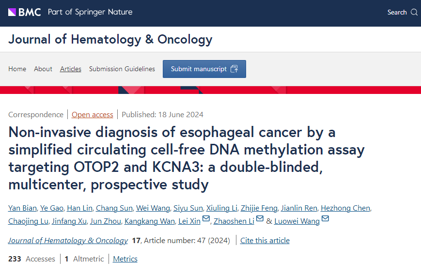 [1] Bian Y, Gao Y, Lin H, et al. Non-invasive diagnosis of esophageal cancer by a simplified circulating cell-free DNA methylation assay targeting OTOP2 and KCNA3: a double-blinded, multicenter, prospective study. J Hematol Oncol. 2024 Jun 18;17(1):47. doi: 10.1186/s13045-024-01565-2.