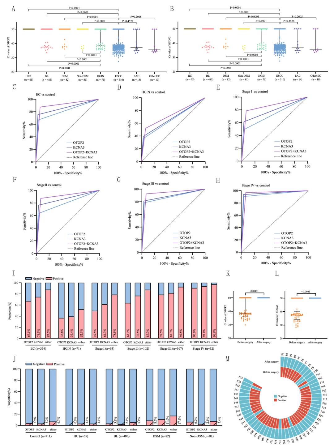 在此基础上,武汉艾米森生命科技公司作为申办方,由李兆申院士团队牵头开展全国多中心研究,全面评价艾思宁®(血浆OTOP2联合KCNA3甲基化检测)诊断食管癌的临床性能。