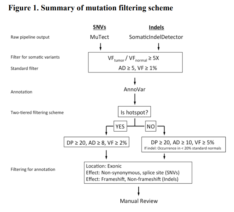 PGDx elio tissue complete的过滤参数:和MSK-Impact类似也是不同的突变设置不同的过滤标准: 有临床意义的突变/热点突变和Indel/非热点SNV/非热点Indel等分别设置不同的过滤标准(Mutant reads相当于上图中的AD,即发生突变的reads;MAF相当于上图中VF,即突变频率): 越是重要的突变过滤标准越低,不过这些位点最后还需要人工IGV审核之后才能报出。 感慨一下:老美真…有钱,产品只要FDA批准不管多贵就能进医保,怪不得FoundationOne和Signatera这么能卖,大Panel上万人民币,WES+定制Panel,两万左右,在美国肯定更贵,全都能报销。。。只看性能,不管价格。 国内不到1千的单癌甲基化早筛试剂盒进医保都费劲,不仅看性能,价格也同样重要,既要又要,哪这么容易。 这会不会引起一个现象:市场上充斥着一堆没经过严格验证的“低价”产品,劣币阻挡了良币的发展?