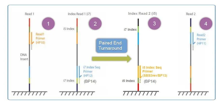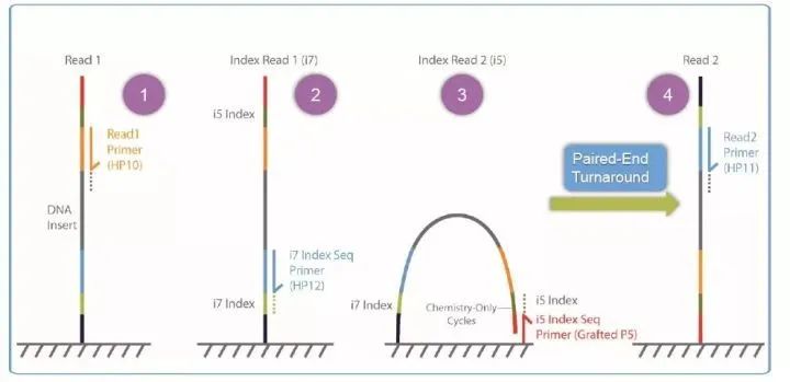 a.Read1读取;b.Index1(i7)读取;c.倒链之后Index 2(i5)读取;d.Read 2读取。