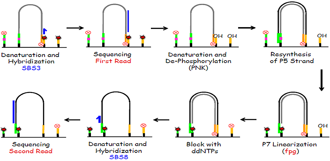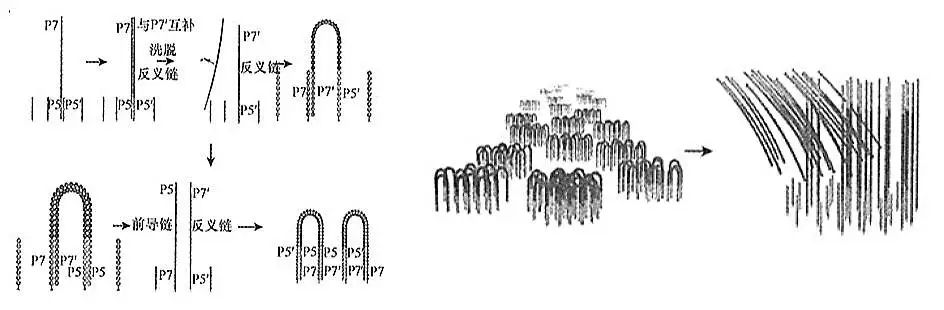 如进行双端测序,洗掉前面复制合成的片段,DNA单链继续在流通池表面形成桥式连接,这时要用AP-endonuclease处理修复P5的3´-OH末端,加入聚合酶,则在P5末端开始DNA复制。复制完成后将P7上的DNA切割并洗掉。