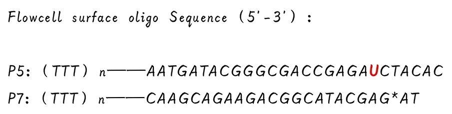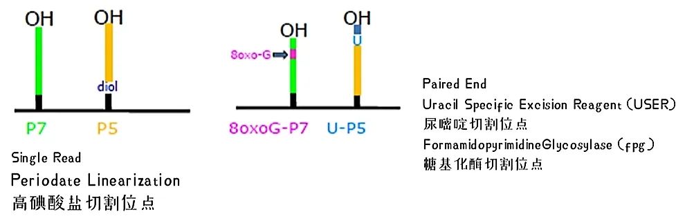 Illumina是通过在P7核酸链中加入一个U碱基,用USER酶来切断DNA链。这时只留下P5上的DNA链,加入测序引物Read2 SP,则可进行另一端的序列读取。