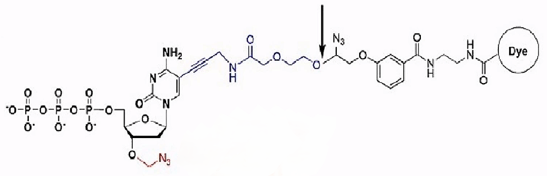 四种颜色的荧光基团用叠氮连接到四种相应的碱基上,同时核苷酸3'末端也用一个叠氮基堵住。叠氮基团在遇到巯基试剂(如二巯基丙醇)时,会发生断裂,并在原来的位置留下一个羟基(-OH),而这个羟基也是碱基原本应有的。