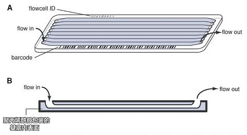 在Illumina测序平台的流通池(Flow cell)表面,固定了无数条分别与文库接头中P5和P7互补的寡核苷酸链(P5和P7各只有一种,从下到上都为5´→3´方向,用于延伸)。