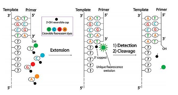 之后洗掉多余的dNTP,使用激光扫描,收集留在流通池表面的荧光信号。用巯基试剂去掉3´端阻断的叠氮基团,用TCEP去掉荧光基团,进入下一个碱基的测序反应。