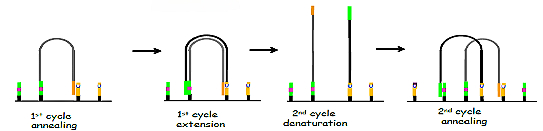 加入NaOH,使DNA解链,中和碱液,“桥”式结构再次形成,再次加入dNTP和聚合酶,再次形成新链……。